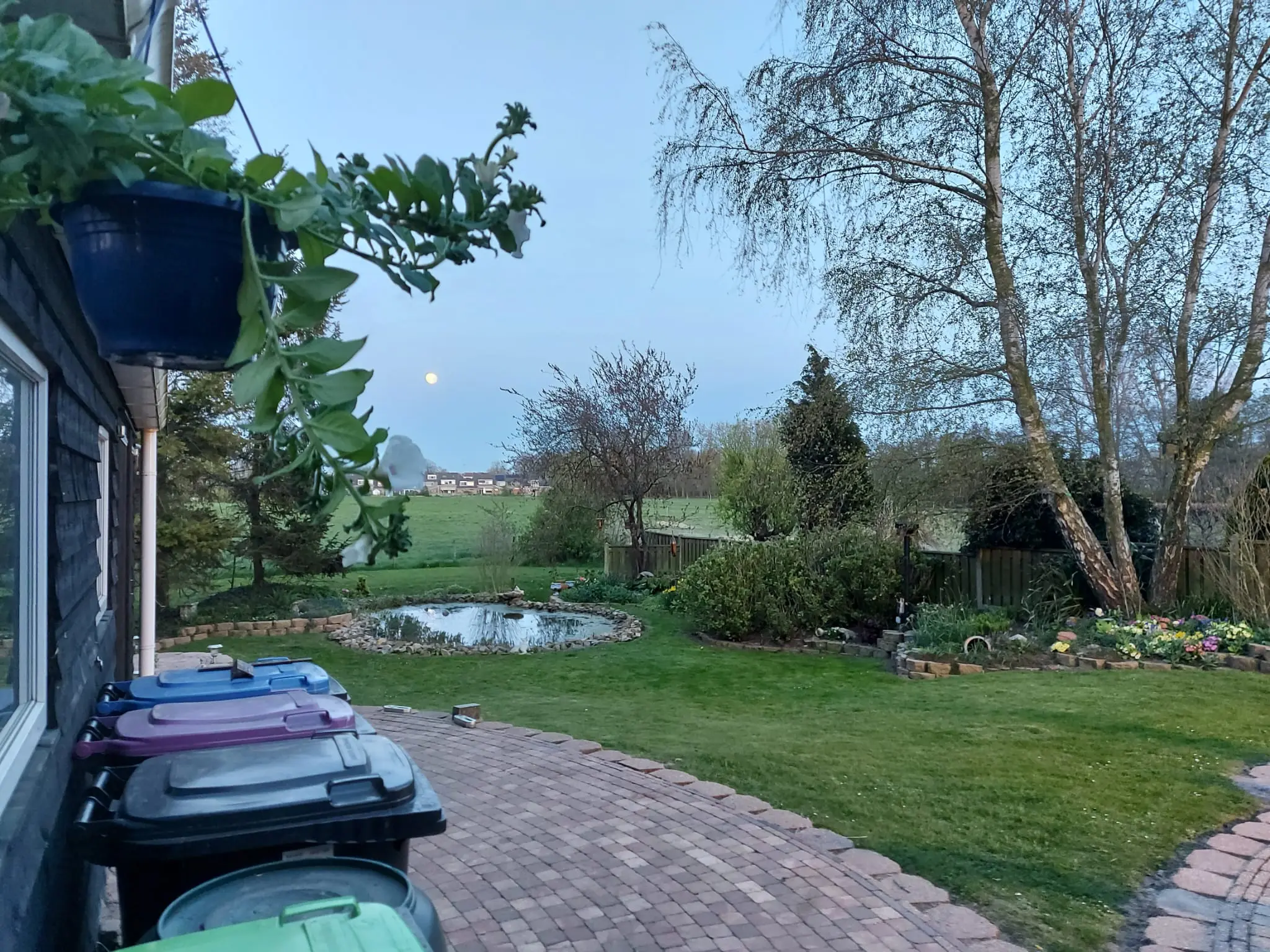 Vanuit de achtertuin heb je schitterend zicht over de weilandenen de omgeving.