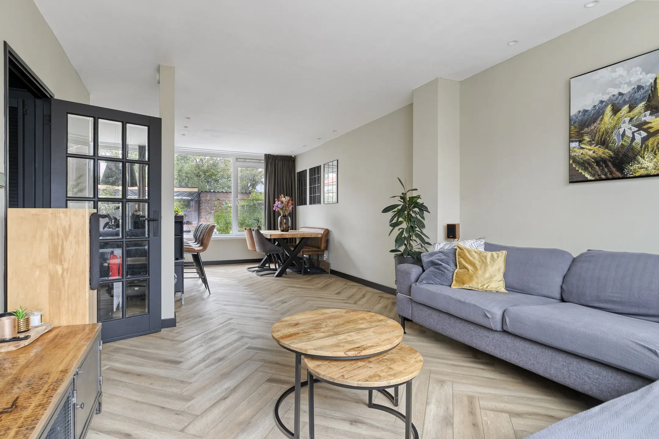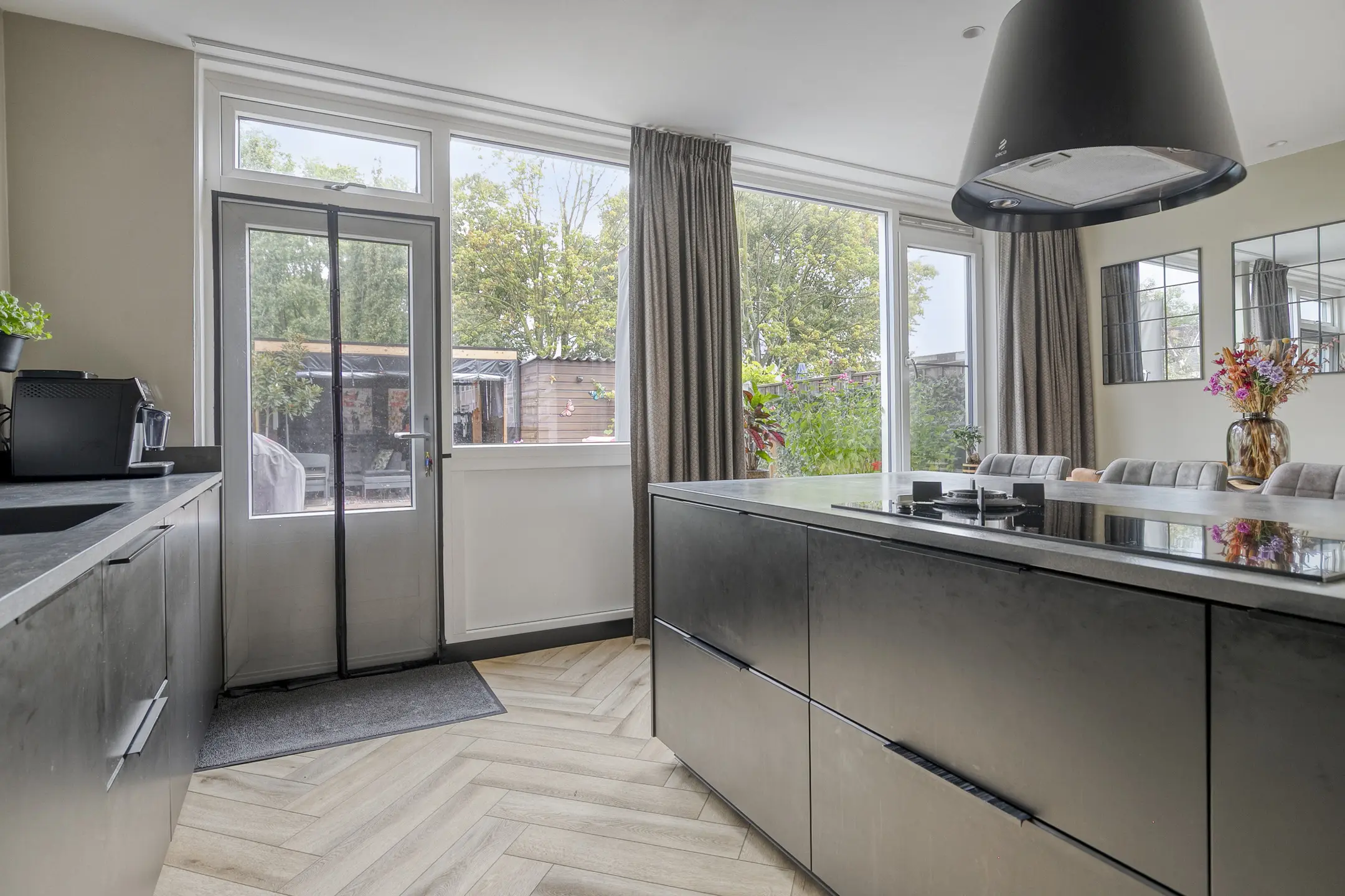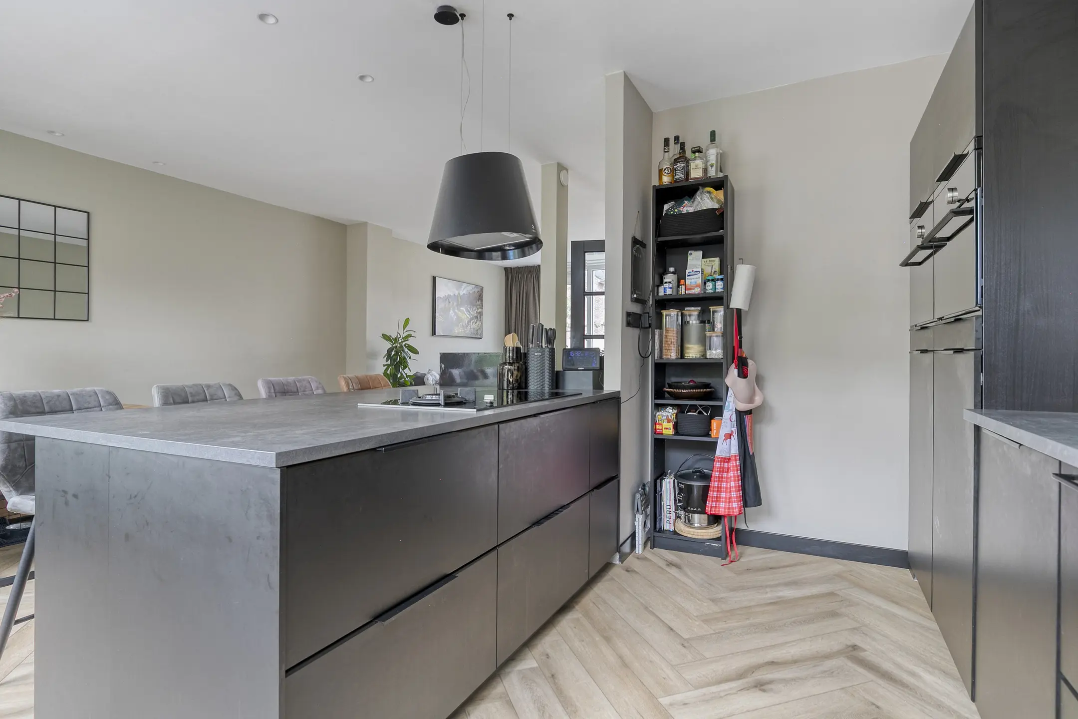Entree/voorportaal met meterkast. Hal met trapopgang, praktische vaste kast en toiletruimte (2022) met marmer look betegeling en modern fonteintje. Middels een deur met glas inzet is de ruime living bereikbaar, deze bestaat uit een woonkamer aan de voorzijde en een open keuken aan de achterzijde van de woning. De zwarte in 2022 geplaatste keuken is compleet uitgerust met een inductiekookplaat met wokbrander, afzuigkap, twee combi-ovens, vaatwasmachine, koelkast en vriezer. Vanuit de keuken is via een deur de keurig aangelegde achtertuin bereikbaar. De wanden en het plafond zijn gestuukt en op de vloer ligt PVC met daaronder vloerverwarming. Het plafond van de begane grond is volledig geïsoleerd en is voorzien van inbouwspots.