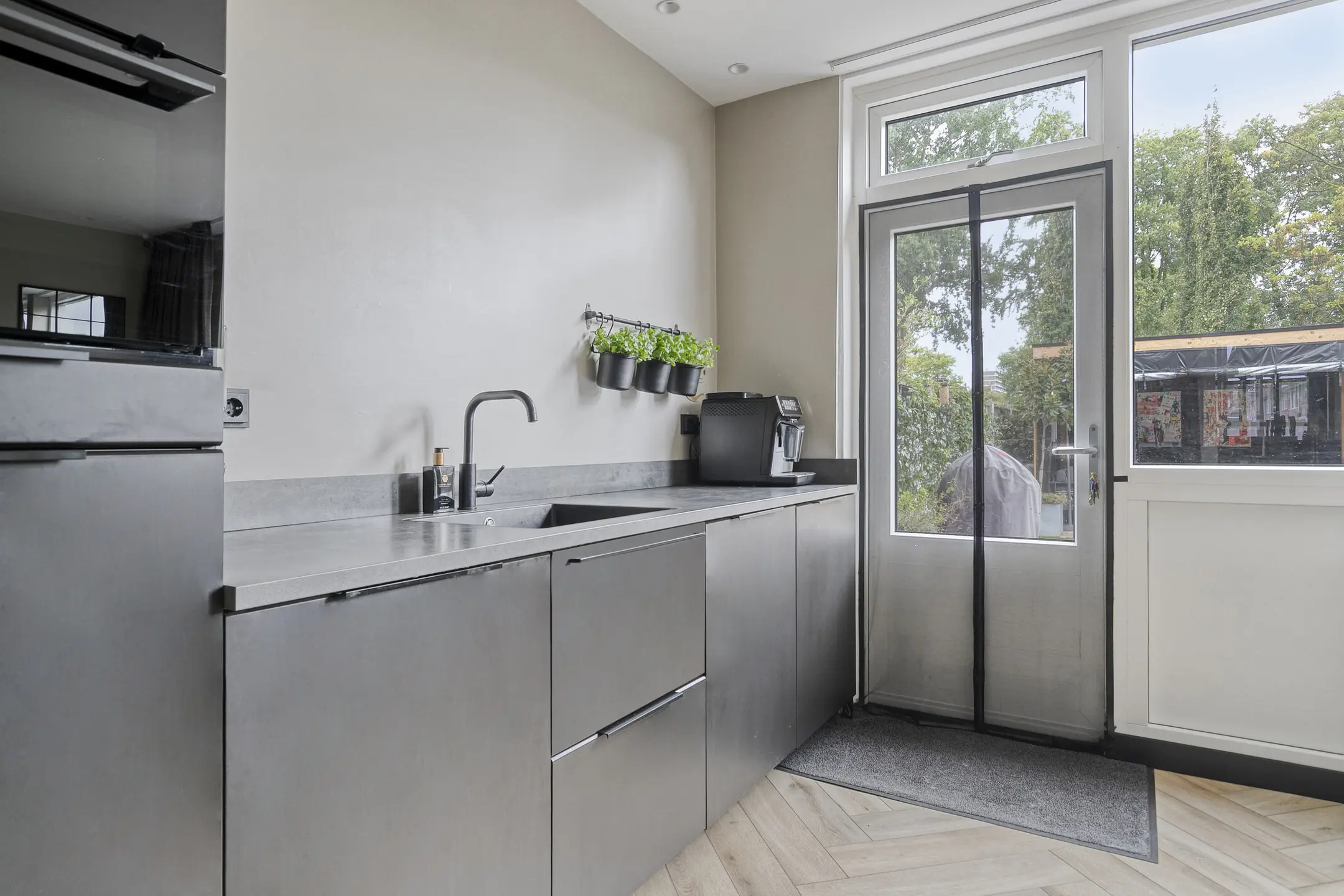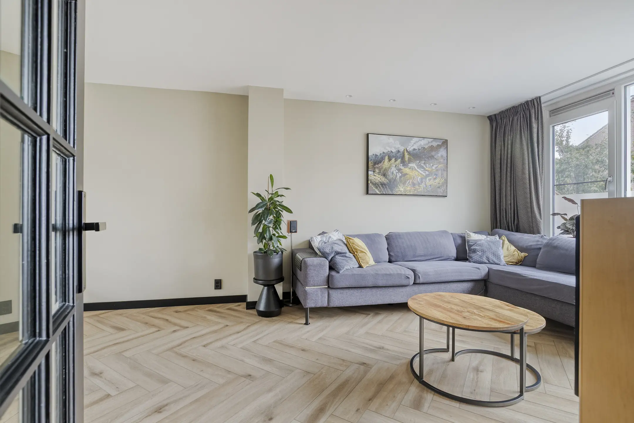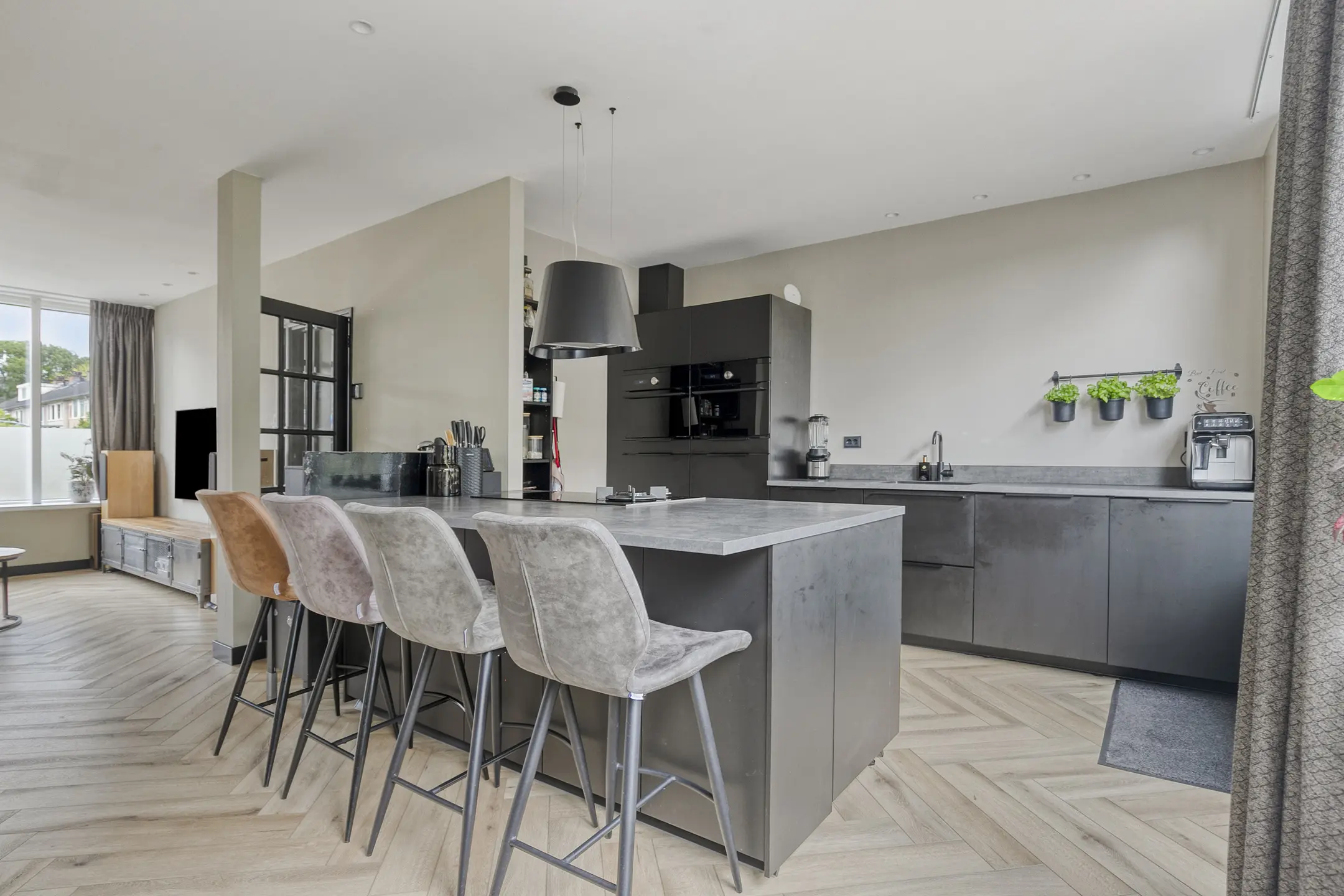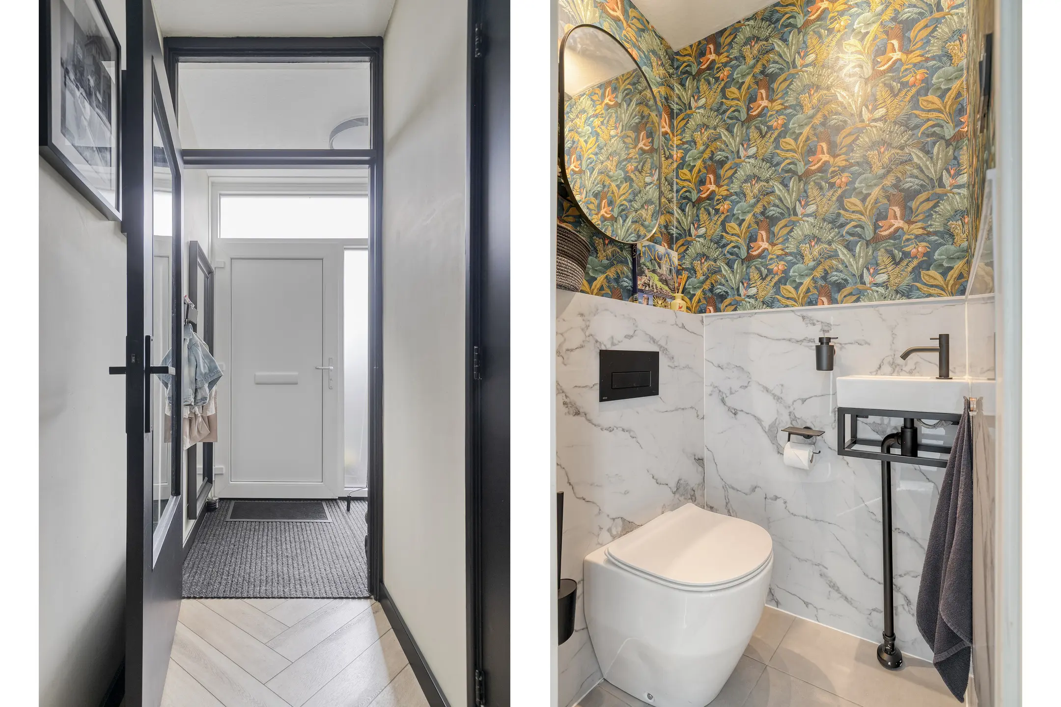 Entree/voorportaal met meterkast. Hal met trapopgang, praktische vaste kast en toiletruimte (2022) met marmer look betegeling en modern fonteintje. Middels een deur met glas inzet is de ruime living bereikbaar, deze bestaat uit een woonkamer aan de voorzijde en een open keuken aan de achterzijde van de woning. De zwarte in 2022 geplaatste keuken is compleet uitgerust met een inductiekookplaat met wokbrander, afzuigkap, twee combi-ovens, vaatwasmachine, koelkast en vriezer. Vanuit de keuken is via een deur de keurig aangelegde achtertuin bereikbaar. De wanden en het plafond zijn gestuukt en op de vloer ligt PVC met daaronder vloerverwarming. Het plafond van de begane grond is volledig geïsoleerd en is voorzien van inbouwspots.