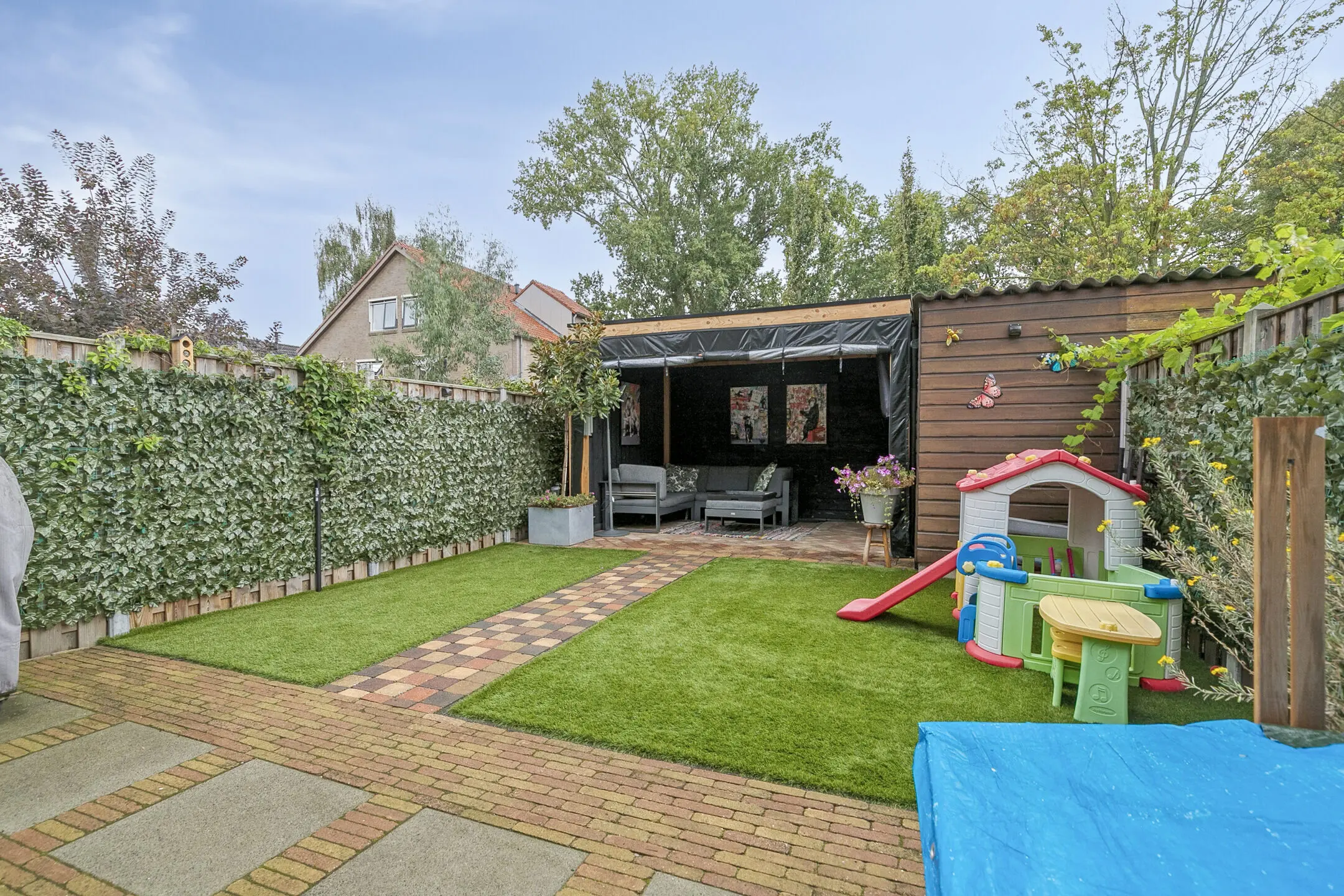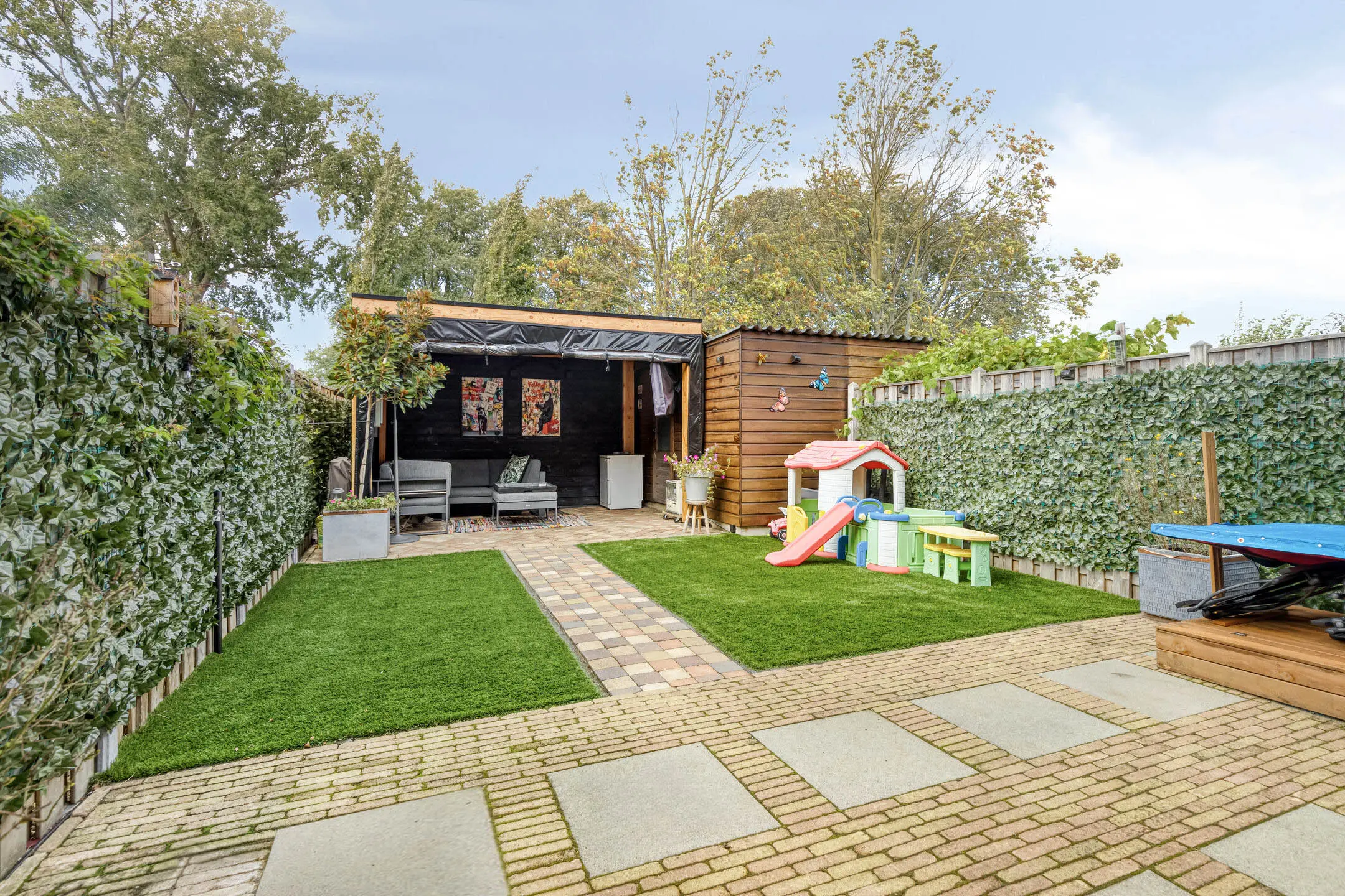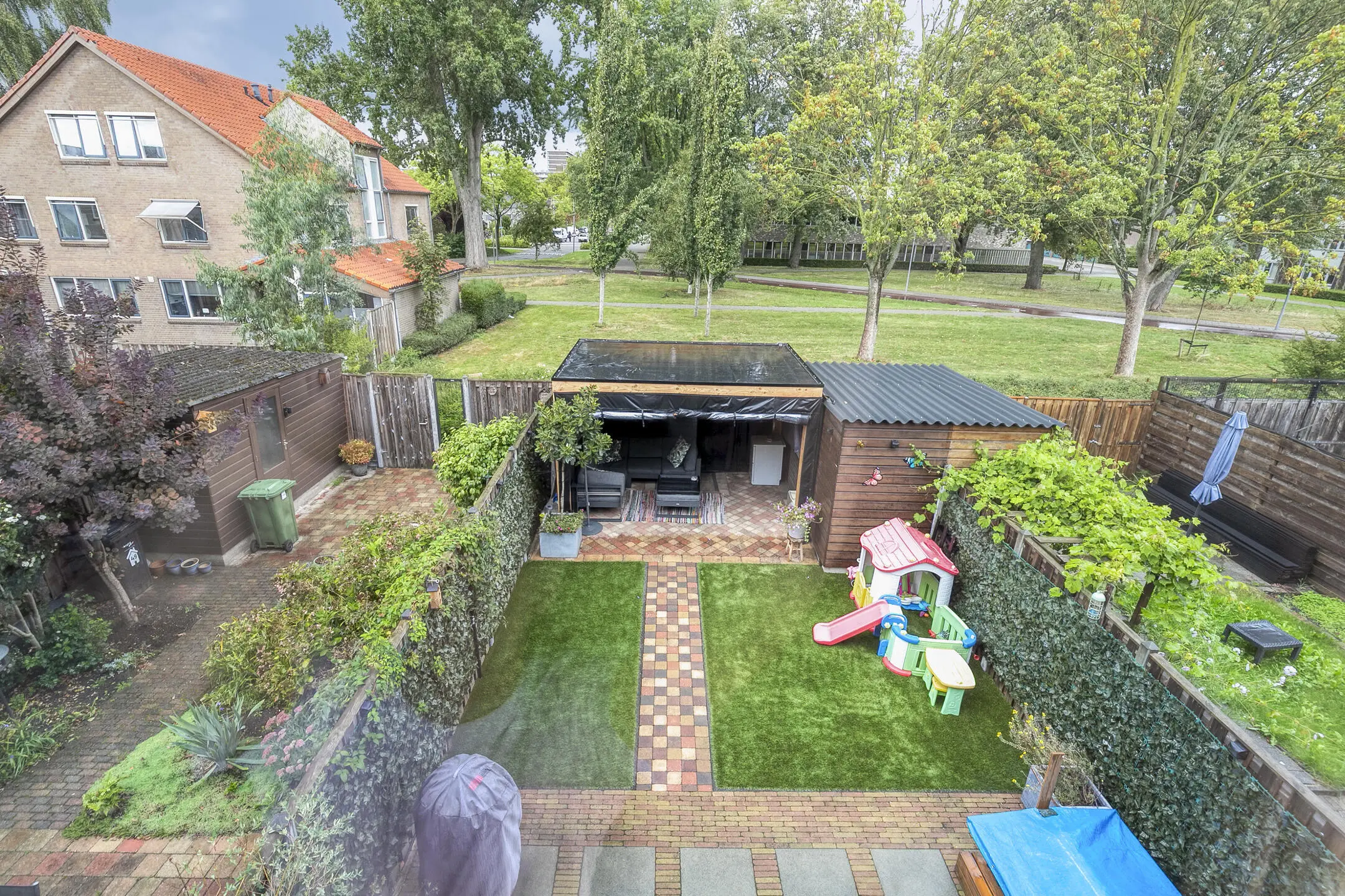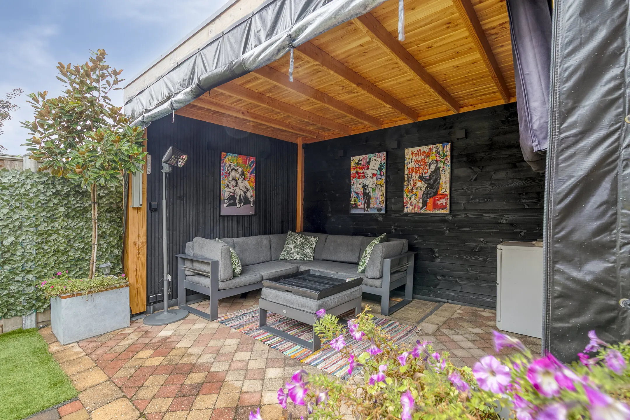 Keurige in 2024 onderhoudsvriendelijk aangelegde zonnig op het zuidoosten gelegen voortuin met hekje en een zonnescherm. De achtertuin ligt op het noordwesten en is eveneens in 2024 vernieuwd, door de diepte van de tuin is hier in de middag ook zon aanwezig. Hier is een buitenkraan aanwezig, een fraaie overkapping met verlichting en een houten berging met elektra en achterpoort.