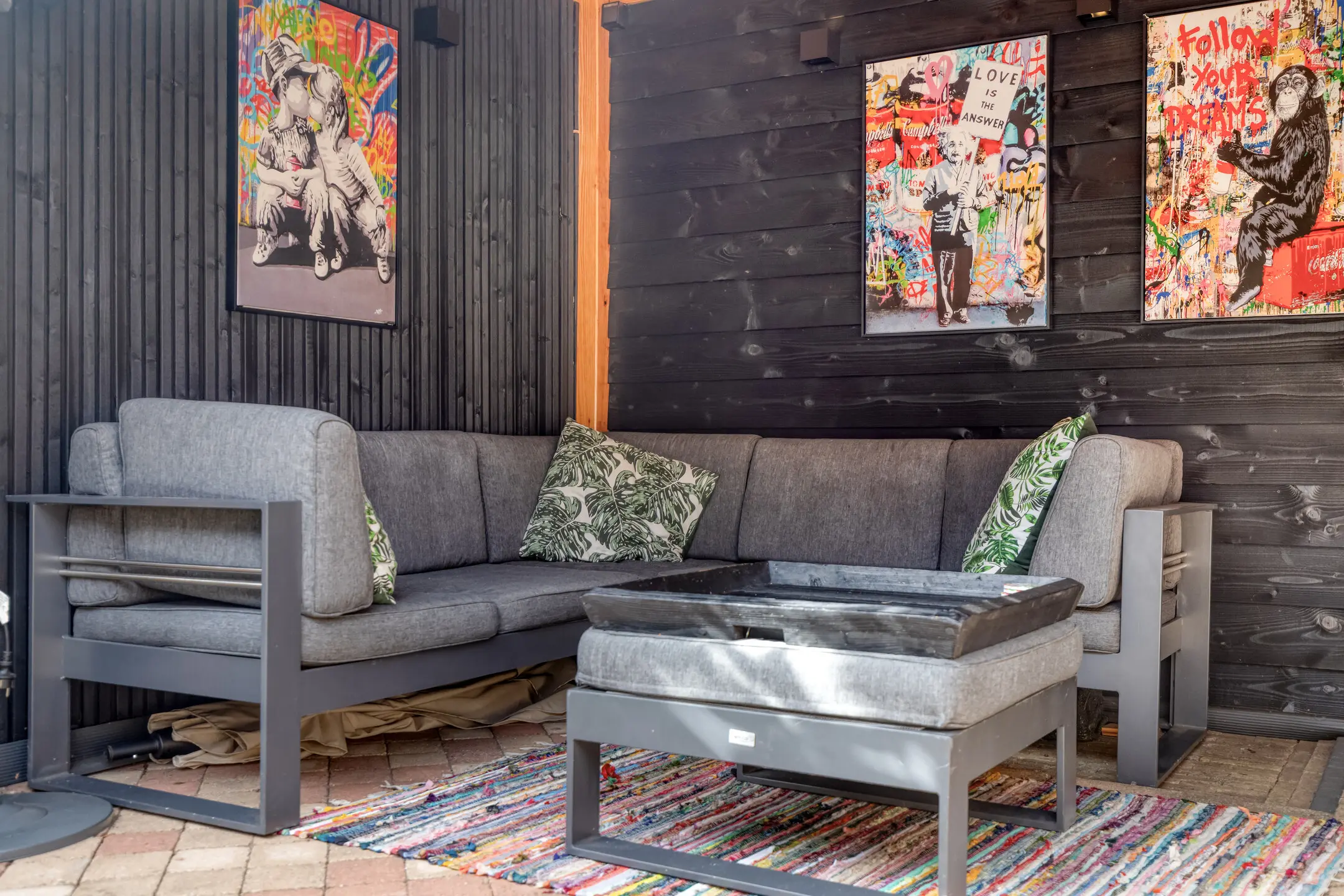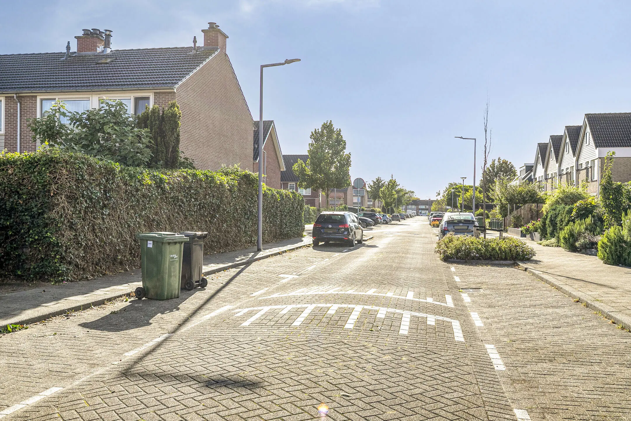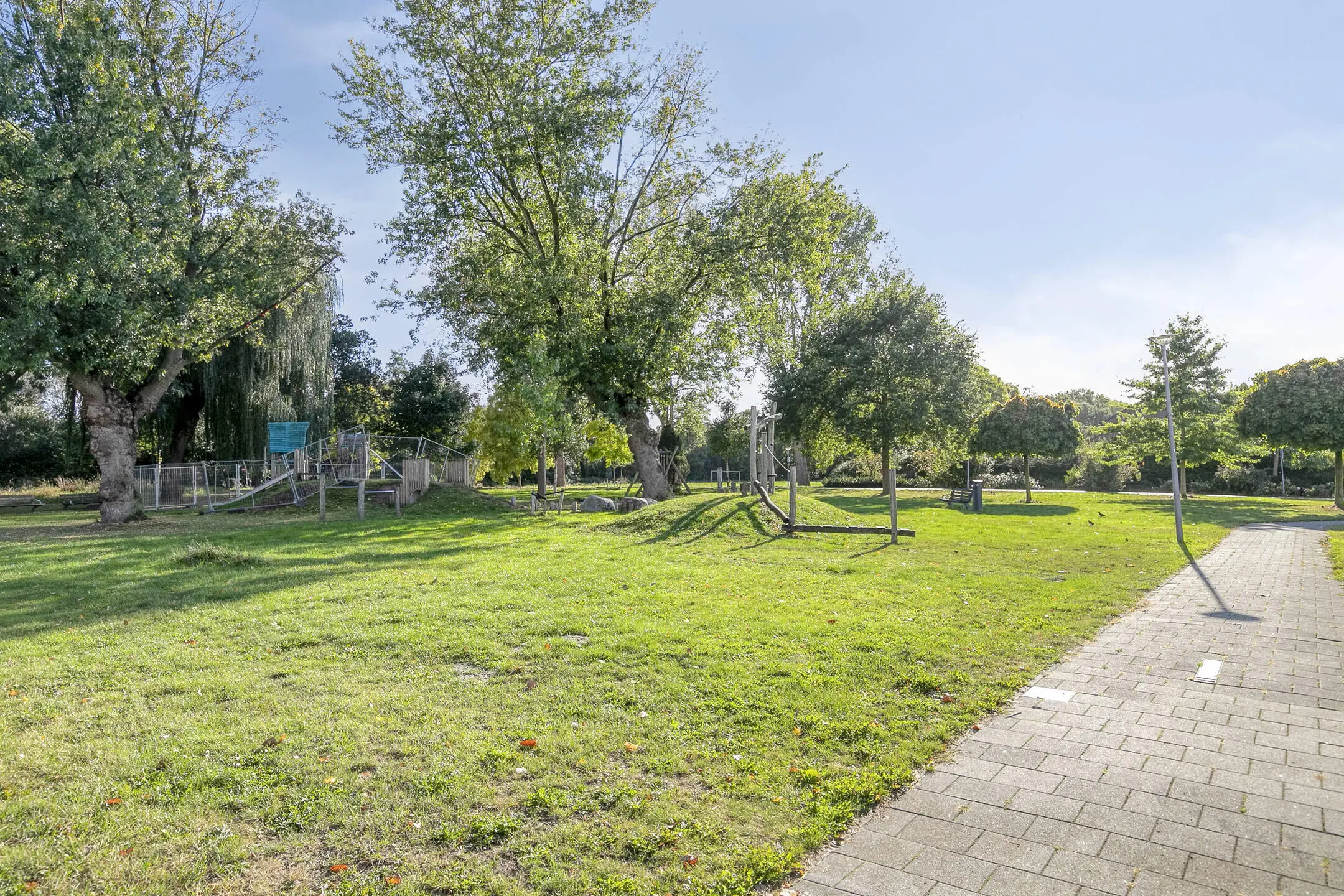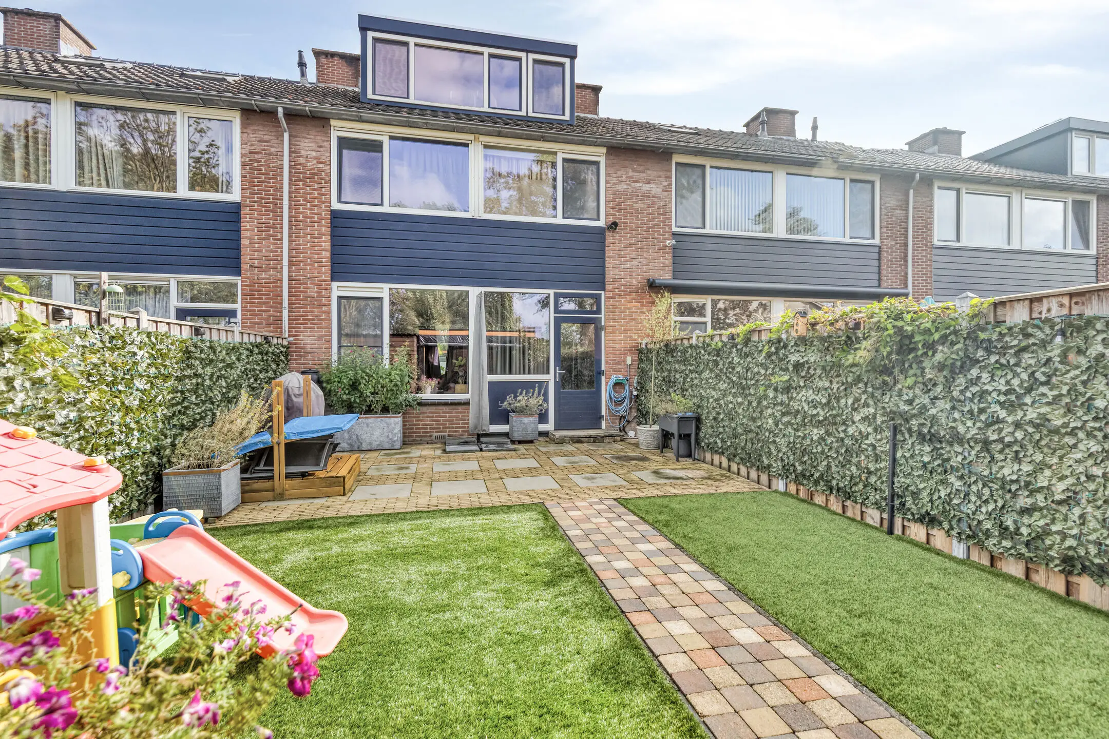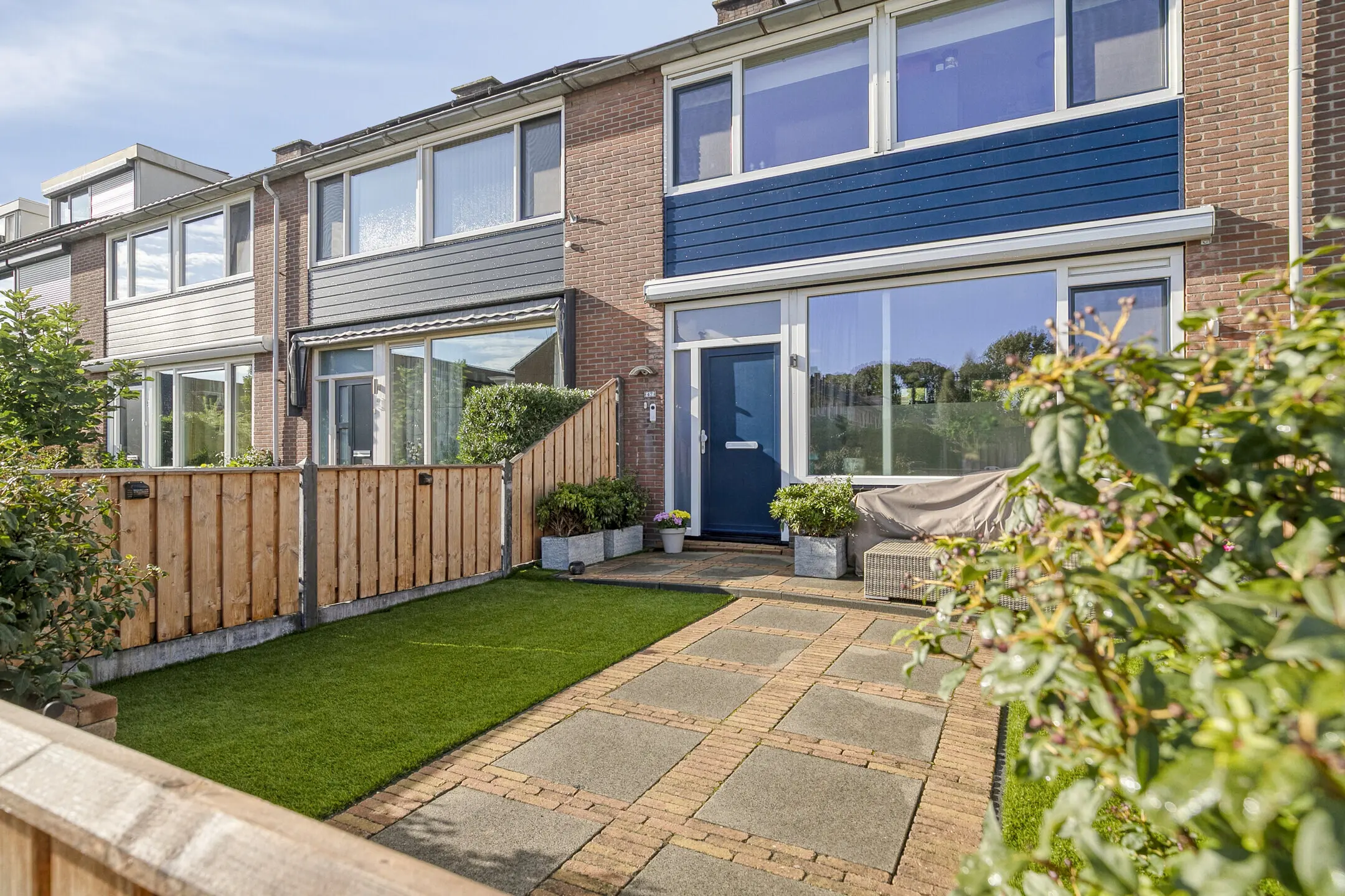 Keurige in 2024 onderhoudsvriendelijk aangelegde zonnig op het zuidoosten gelegen voortuin met hekje en een zonnescherm. De achtertuin ligt op het noordwesten en is eveneens in 2024 vernieuwd, door de diepte van de tuin is hier in de middag ook zon aanwezig. Hier is een buitenkraan aanwezig, een fraaie overkapping met verlichting en een houten berging met elektra en achterpoort.