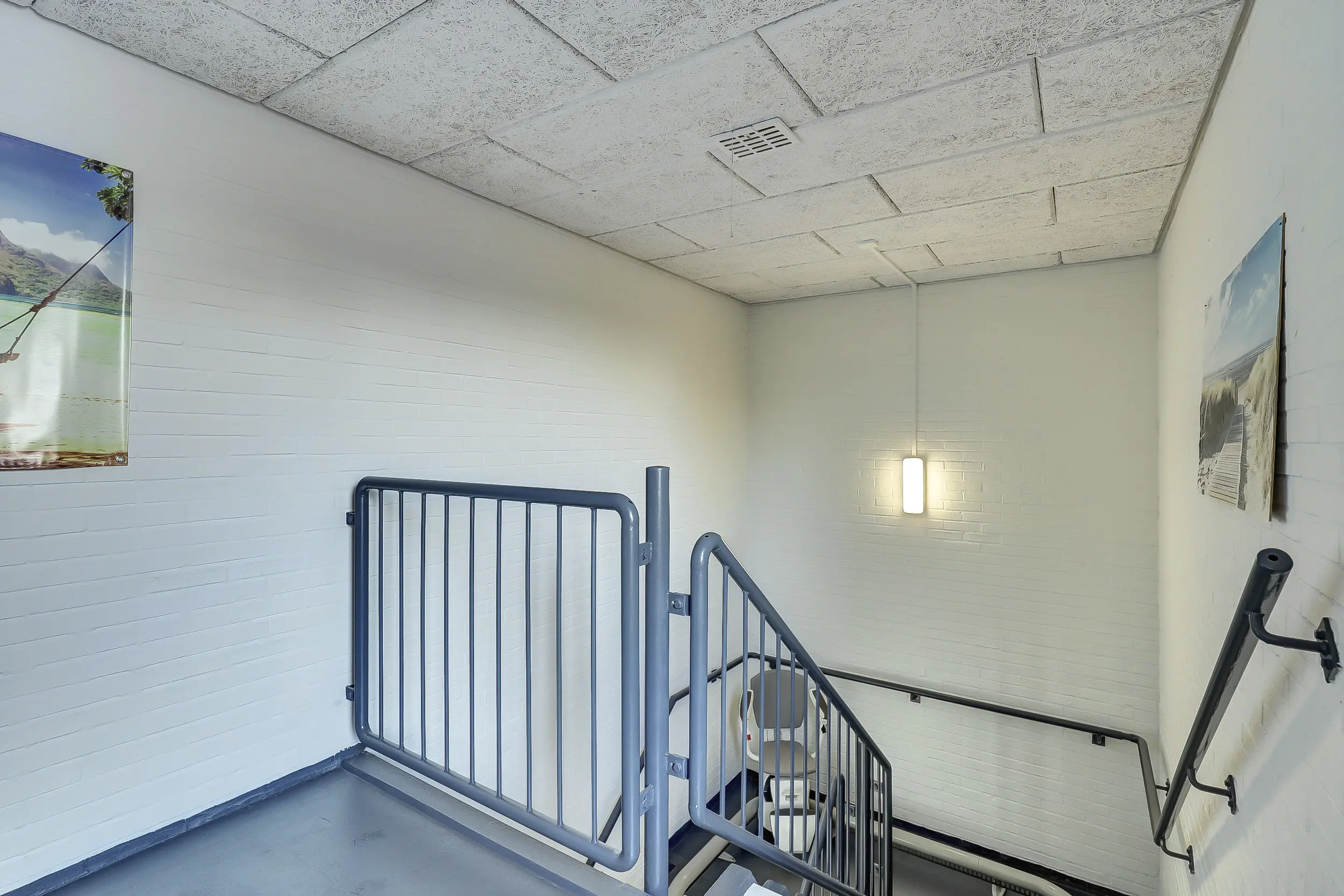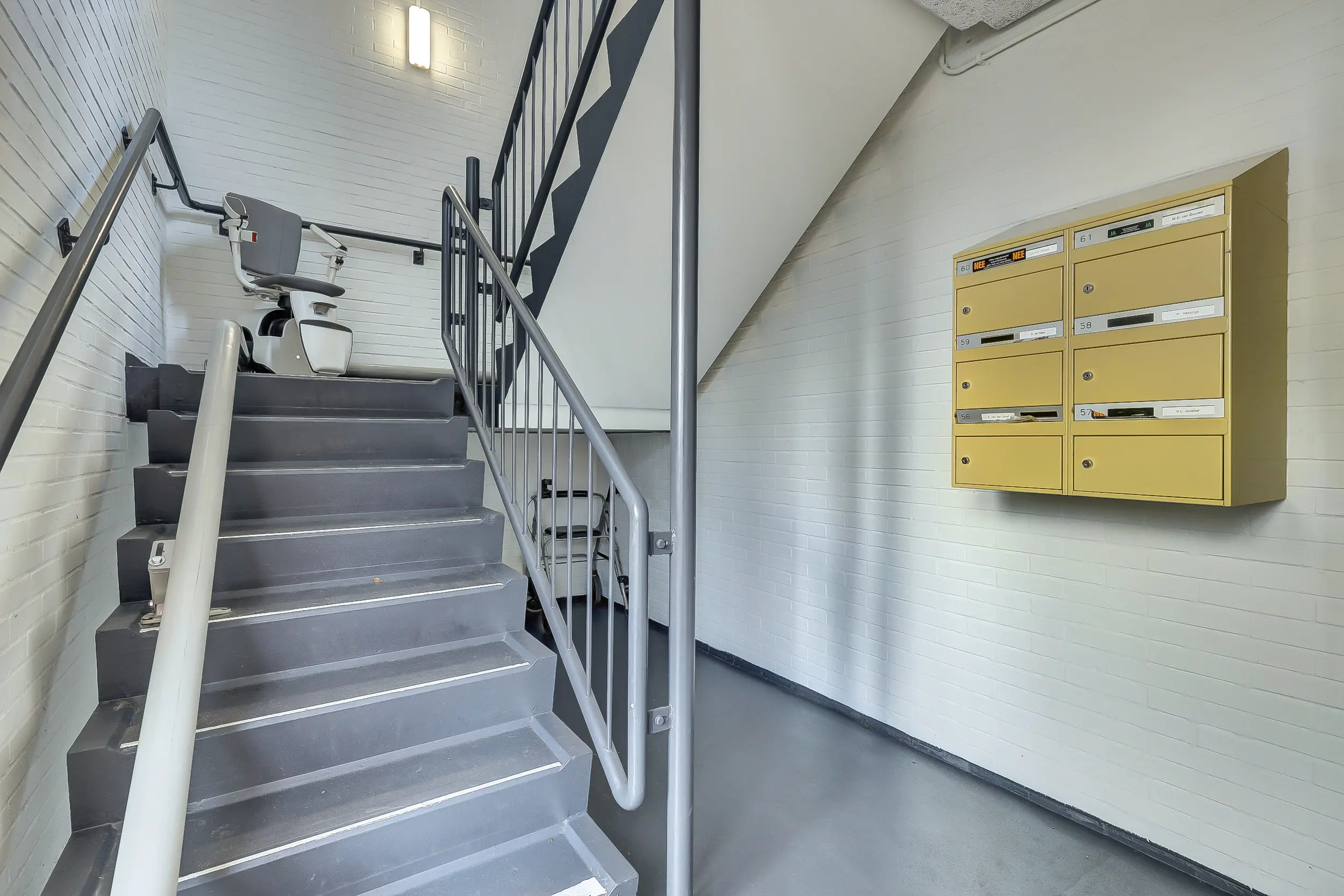 Het overdekte trappenhuis is voorzien van een traplift en hier zijn ook de brievenbussen voor de 1e verdieping.