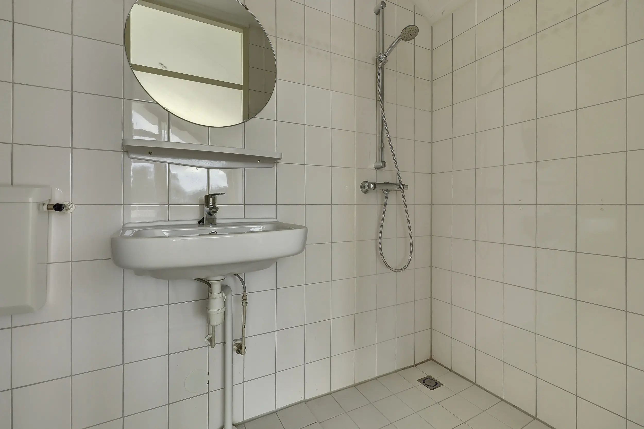 De woonkamer heeft een mooie raampartij met hoog plafond. Vanaf hier is toegang tot de ruime slaapkamer met een deur naar het balkon. De badkamer is voorzien van een toilet, douche met thermostaatkraan en wastafel. De badkamer is zowel vanuit de entree/hal als de slaapkamer te bereiken. De dichte keuken is gelegen aan de voorzijde. Een nette basic keukenopstelling met wasmachineaansluiting.