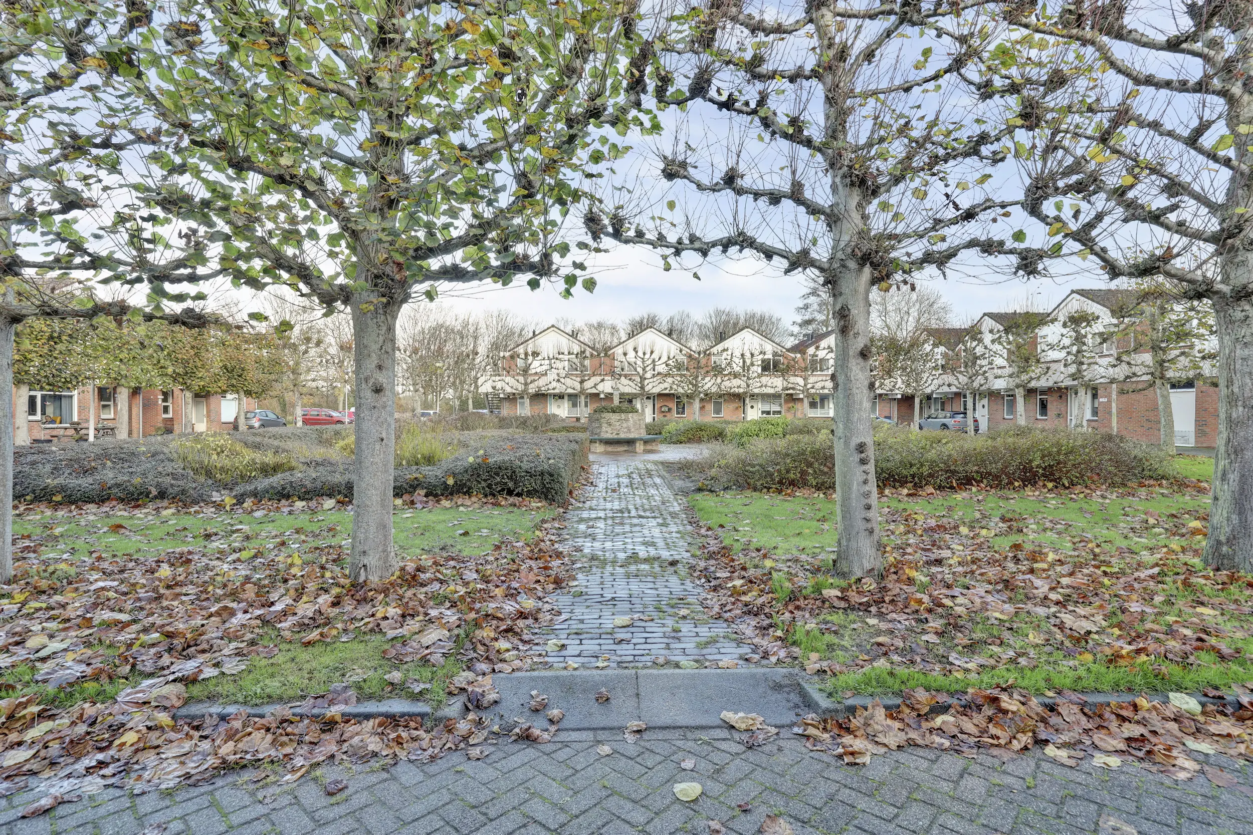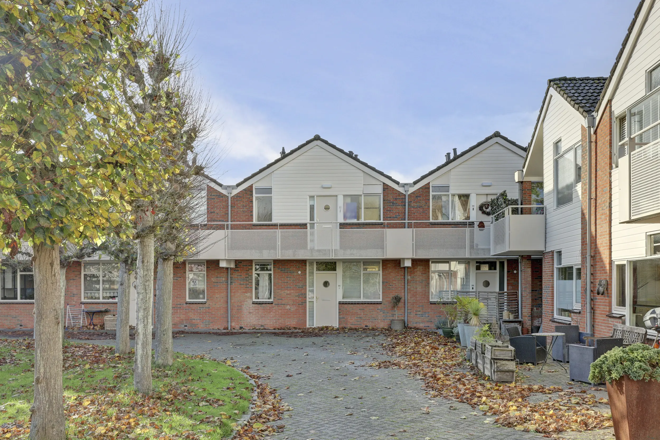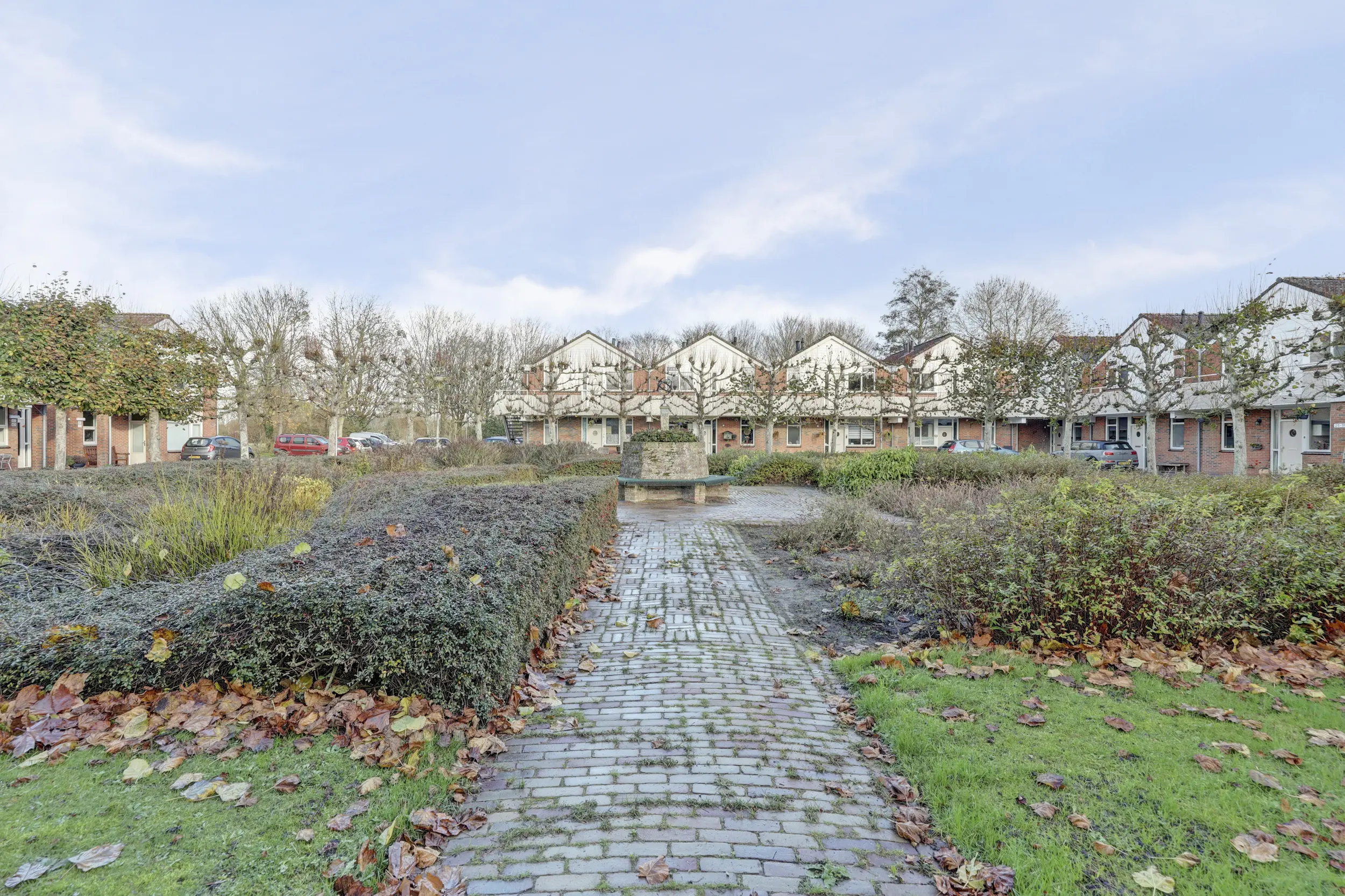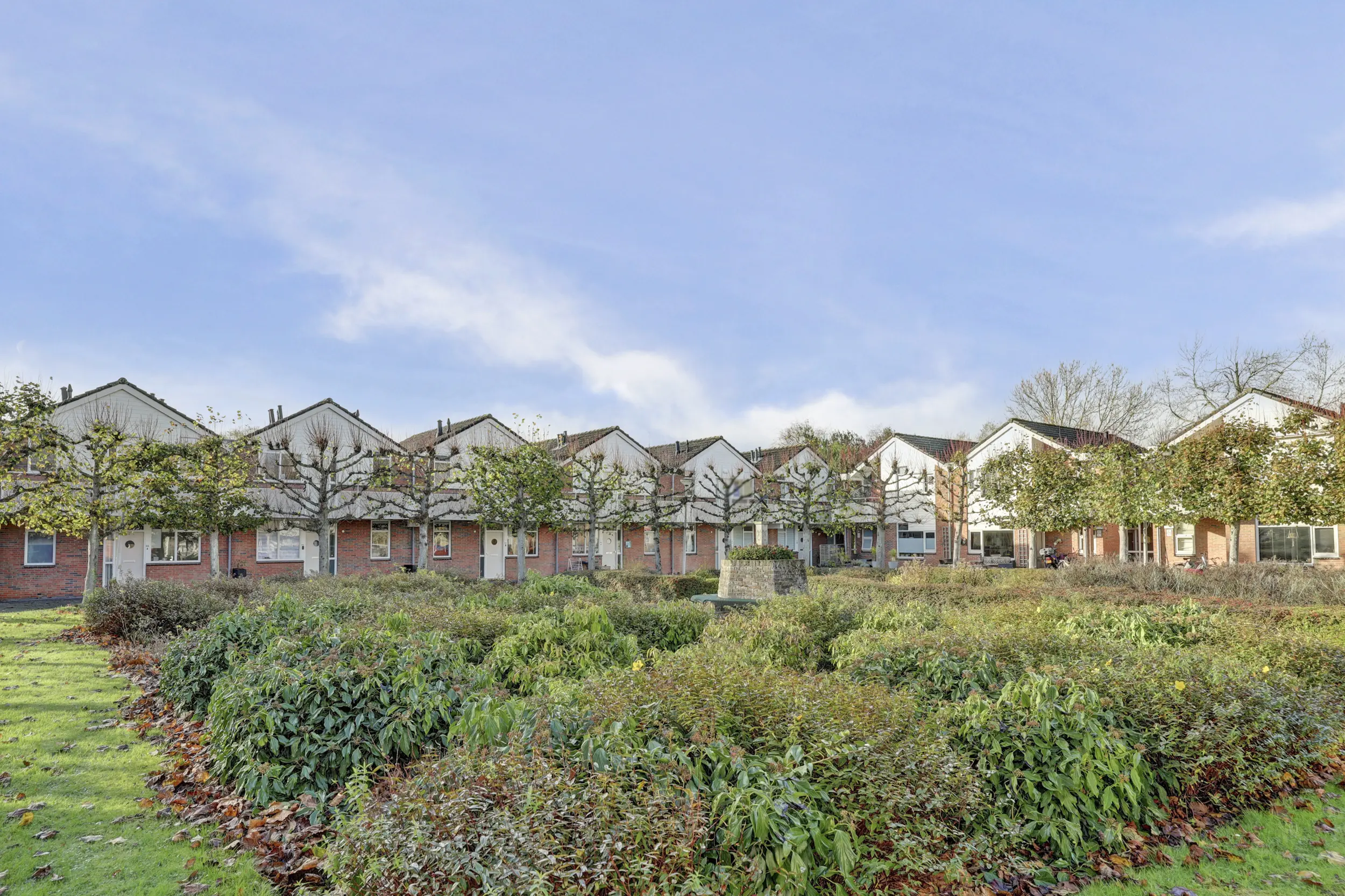 Het hofje heeft een plantsoen met leibomen en een gezellig zitje met daaromheen het twee laags appartementencomplex.