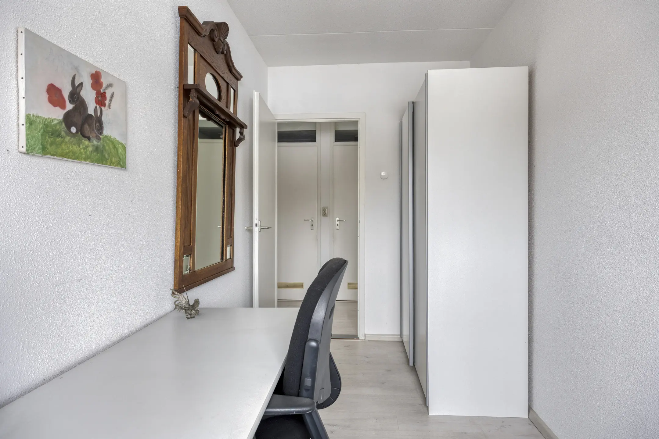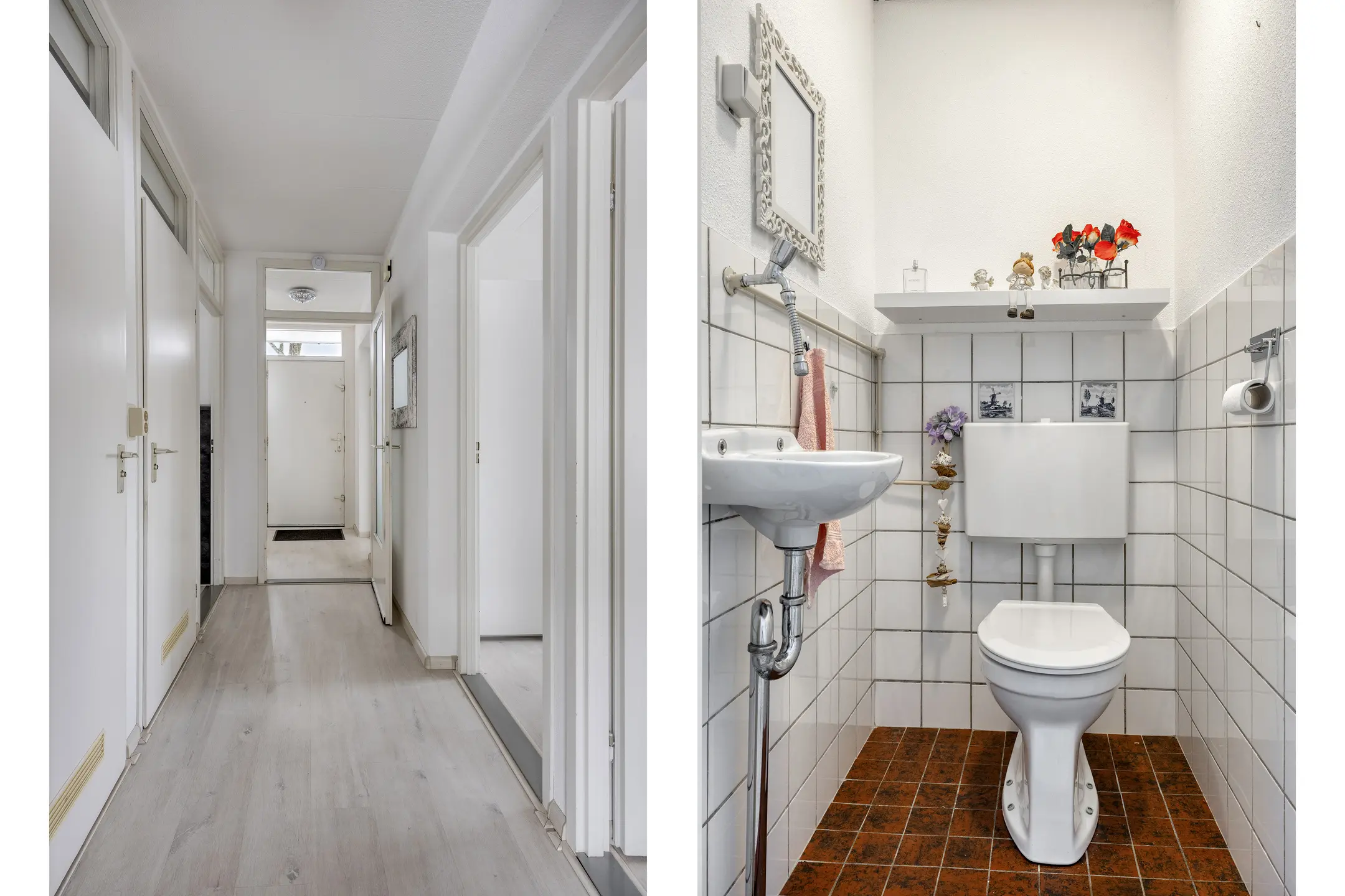 Wanneer je binnenkomt, bevindt zich direct de entree van de woning, waar ook de meterkast is gesitueerd. De eerste slaapkamer is bereikbaar via de entree, ideaal als werkruimte of gastenkamer. Bij verder doorlopen kom je in de gang, die toegang biedt tot de overige vertrekken.