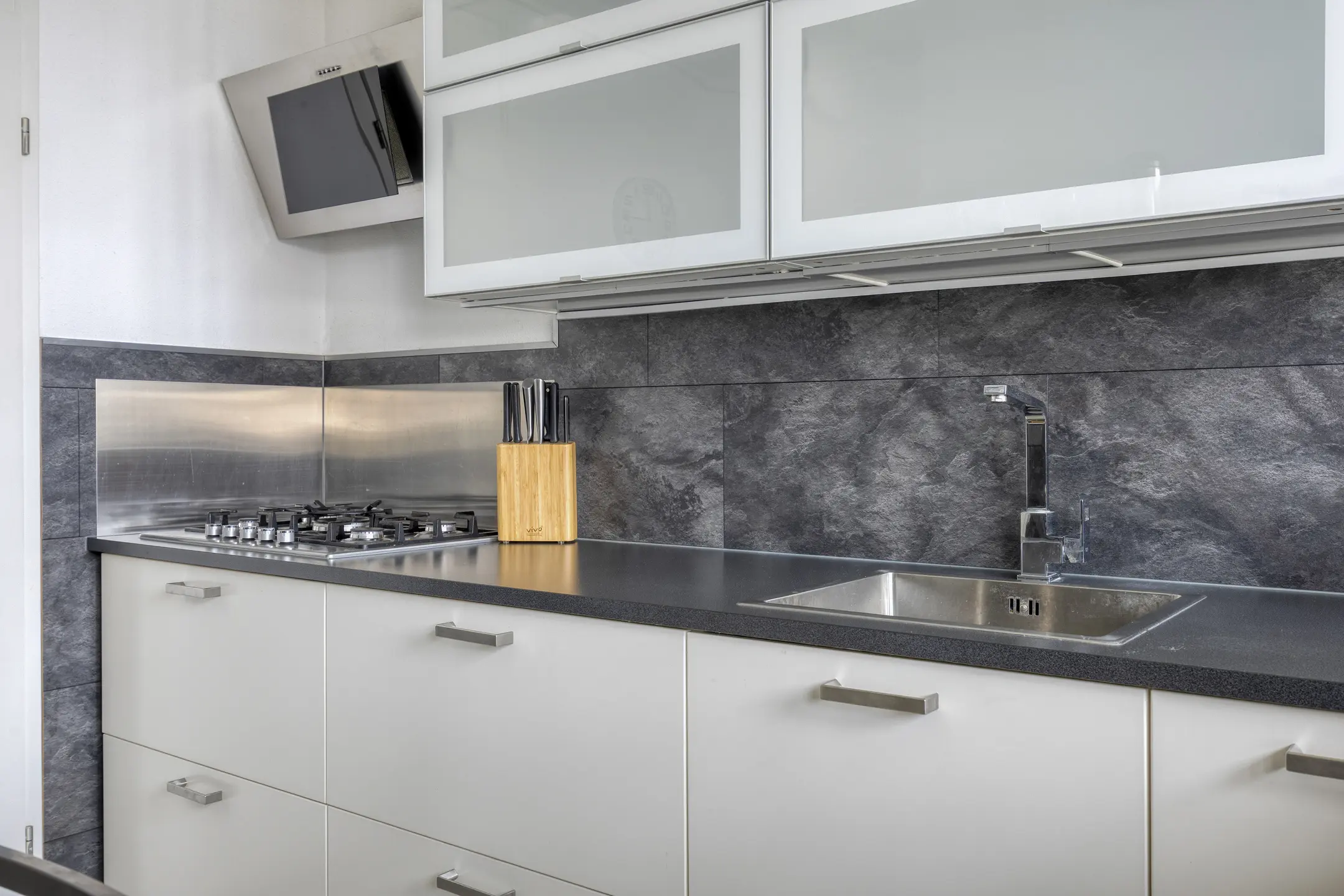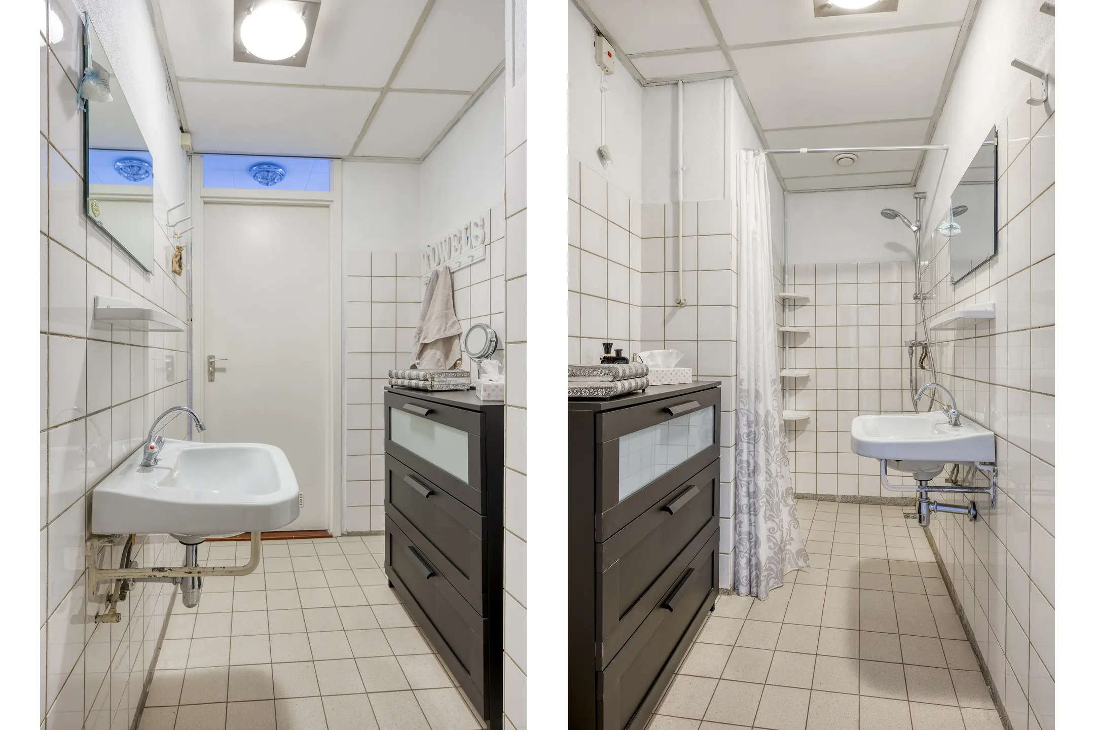 Aan de rechterkant van de gang vind je de keuken en eethoek. De keuken is praktisch ingericht en voorzien van een fornuis en afzuigkap. De badkamer is voorzien van een wastafel en een ruime inloopdouche. Daarnaast is er een apart toilet, gelegen naast de badkamer.