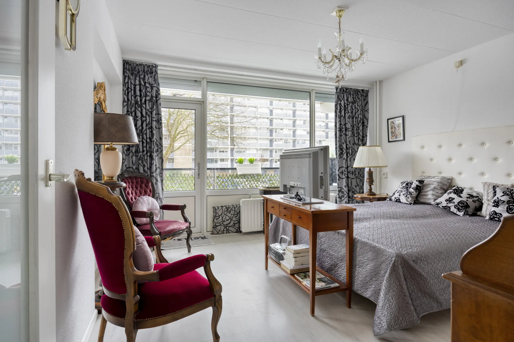 De grootste slaapkamer bevindt zich aan de achterzijde van het appartement en biedt toegang tot het balkon, waar je heerlijk kunt ontspannen. De woonkamer is ruim en licht, gelegen naast de grootste slaapkamer, wat zorgt voor een prettige ruimte om tot rust te komen.