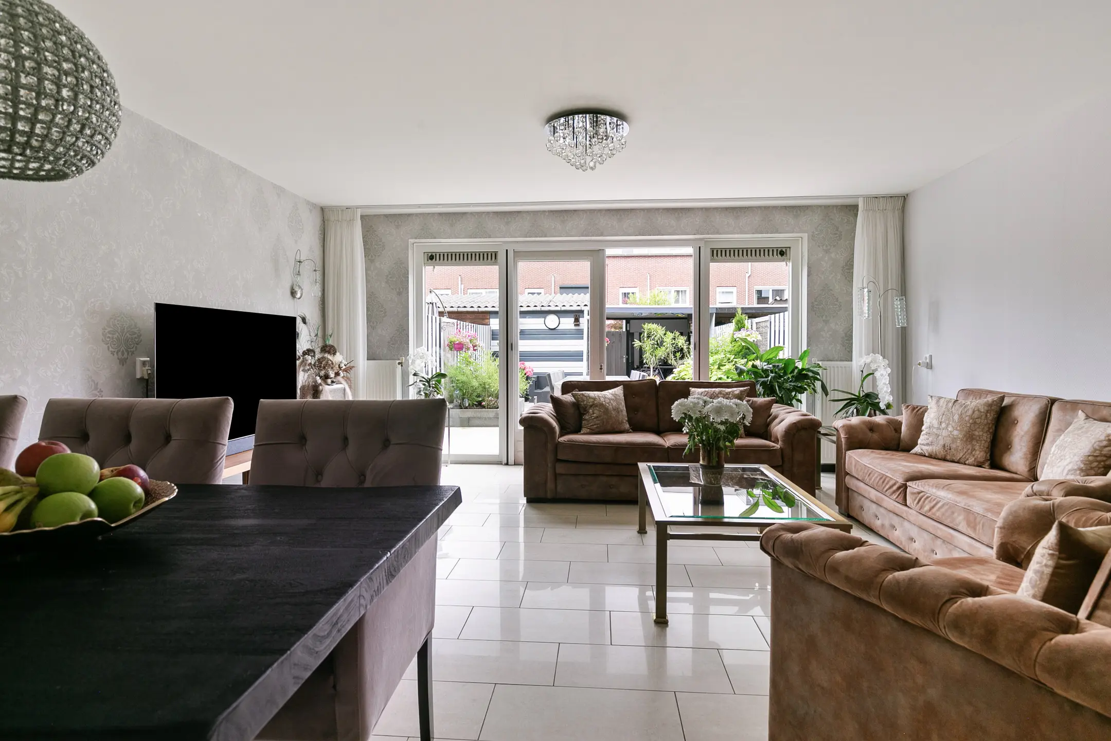 Entree, hal met meterkast, trapopgang en praktische vaste kast. In 2021 vernieuwde geheel betegelde (wit/grijs) toiletruimte met wandcloset en hoekfonteintje. Deur naar de royale living bestaande uit een tuingerichte uitgebouwde woonkamer met openslaande deuren (met 2x plisséhor, 2024) naar de tuin en een aan de voorzijde gesitueerde keuken. De lichte keuken in L-opstelling met donker granieten blad is uitgerust met inbouwapparatuur: brede inductie kookplaat (2023), afzuigkap (met afvoer naar buiten), oven, koel-/vriescombinatie, vaatwasmachine, magnetron (2024), carrouselkast en 1 1/2 spoelbak voor het raam. Het blad van de keuken is doorgetrokken zodat er een eetbar is ontstaan. Op de begane grondvloer liggen lichte vloertegels met daaronder vloerverwarming als hoofdverwarming.