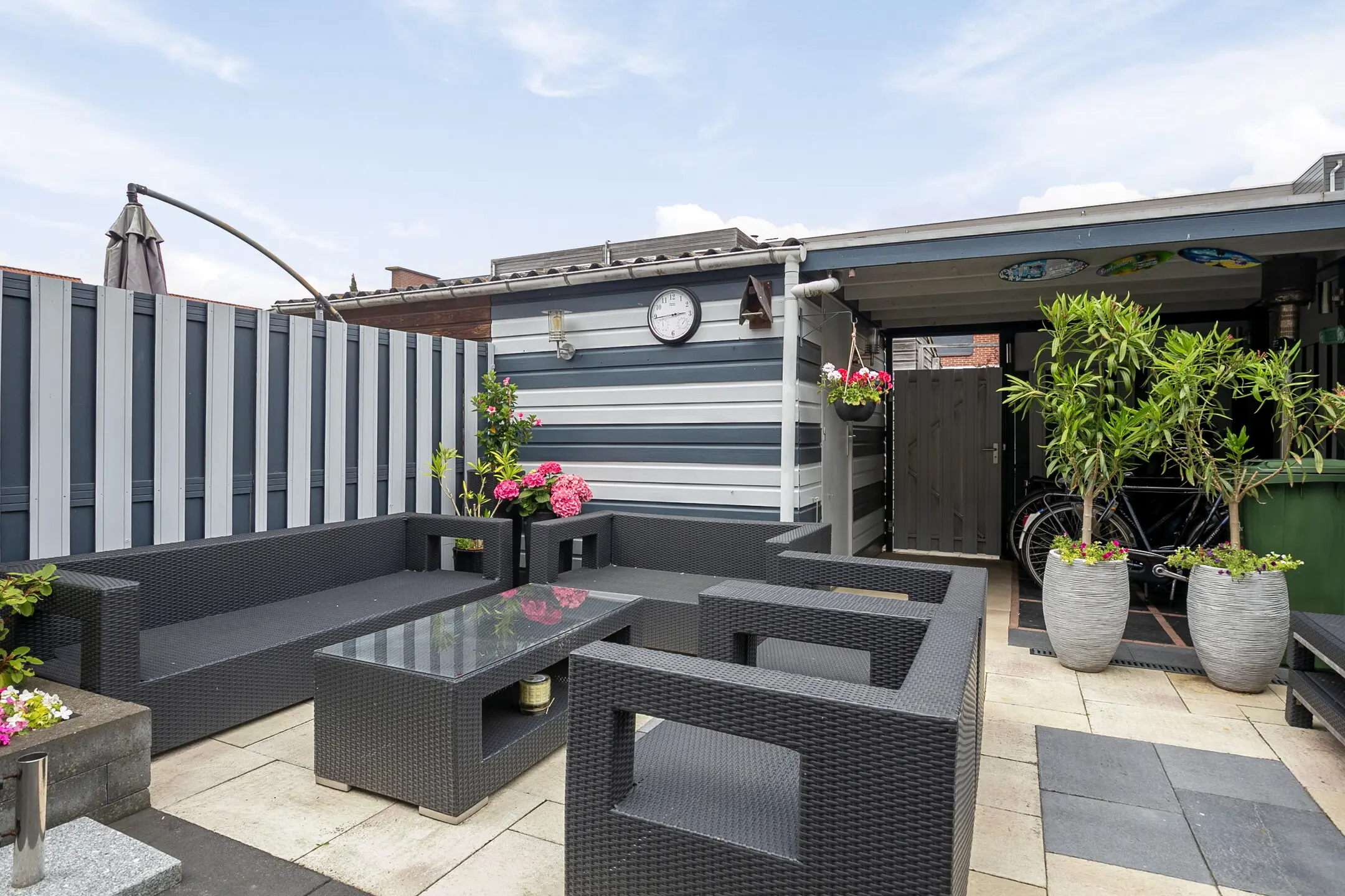 Op het noorden gelegen verzorgde onderhoudsvriendelijke achtertuin met fraaie vaste beplanting en verlichting. Er is een achterom aanwezig, een buitenkraan, een houten berging met elektra en een extra overkapping waar bijvoorbeeld fietsen onder kunnen worden geplaatst. De zonnige voortuin (zuiden) omheind met een fraai hekwerk, er is buitenverlichting aanwezig, een buitenkraan en een fraaie palmboom.