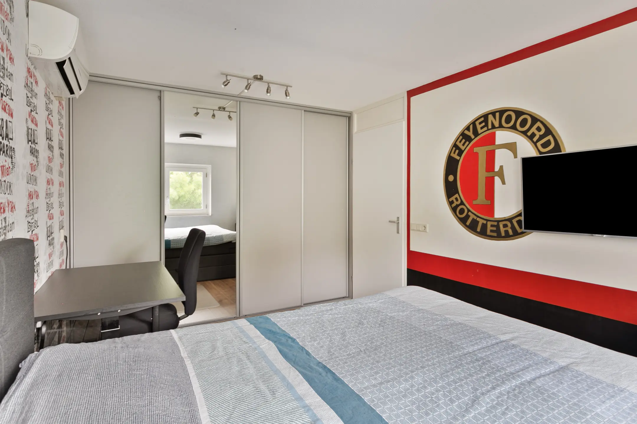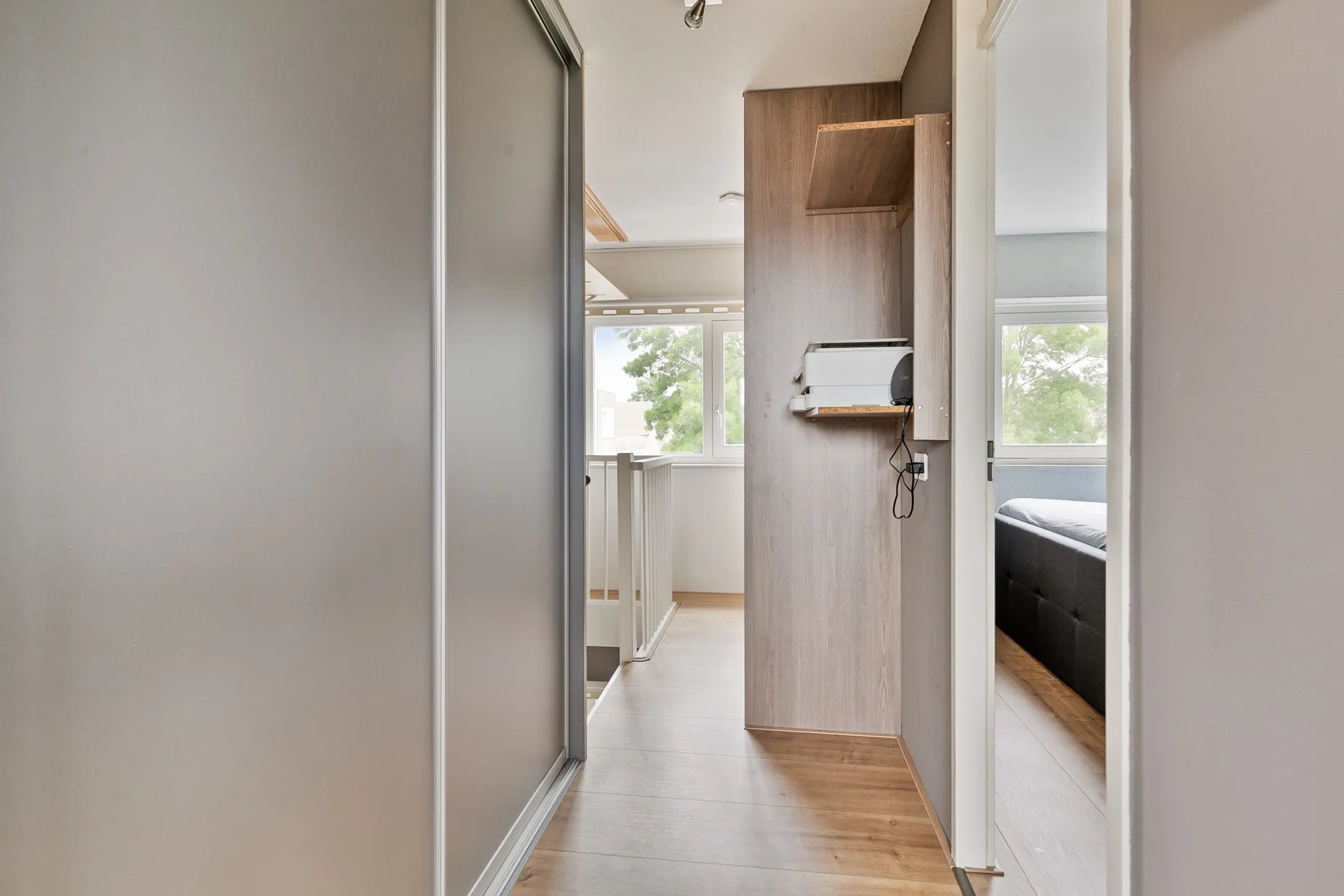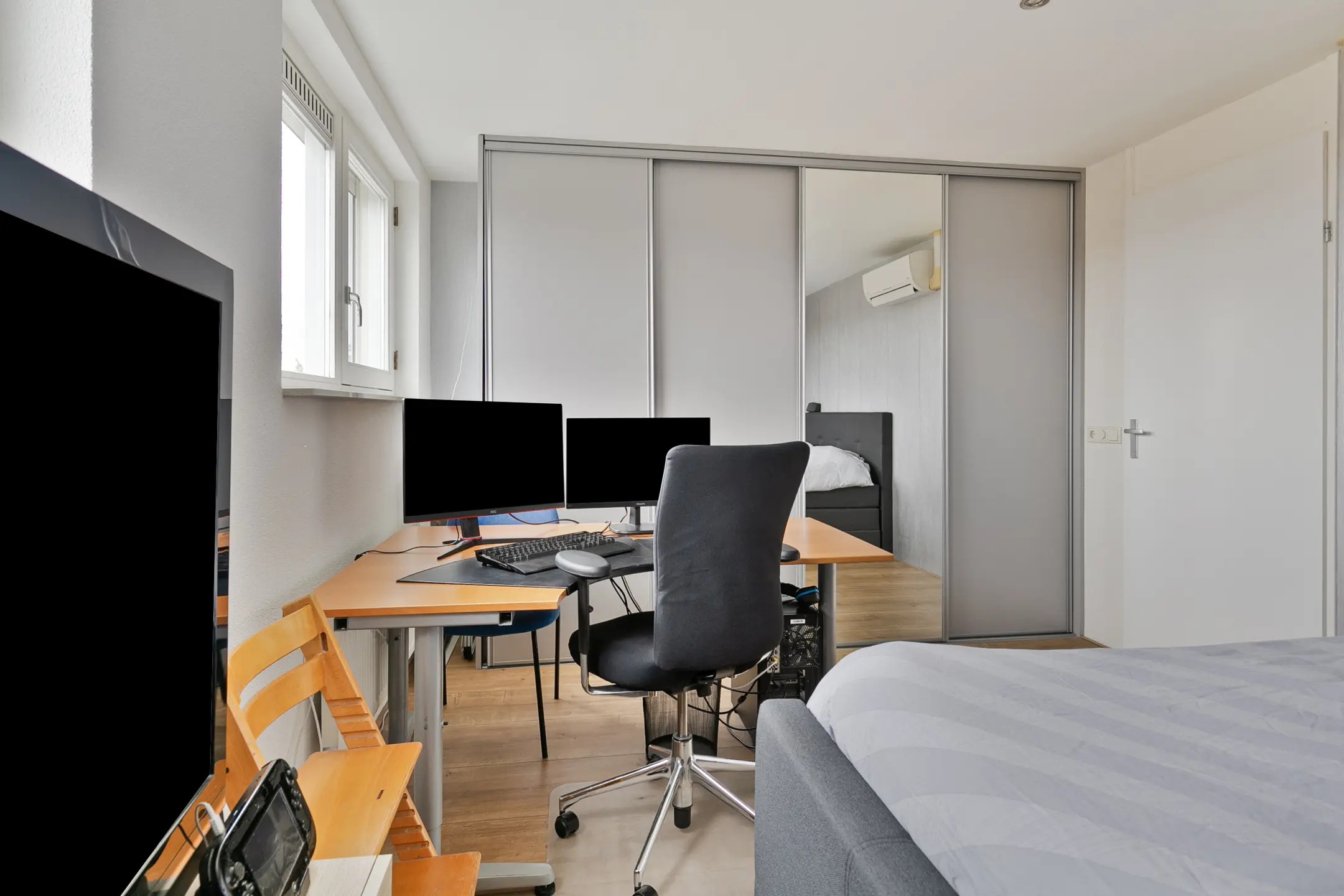 Middels vaste open trap bereikbare overloop met 2 vaste schuifkasten met daarin de aansluitingen voor de wasmachine en droger, de omvormer van de zonnepanelen en de mechanische ventilatie unit. Doordat het terras bij de woning is getrokken zijn hier 2 riante slaapkamers gerealiseerd, beiden met een vaste schuifkastenwand met spiegeldeur en airco voor koeling of verwarming. De ramen van de kamers zijn voorzien van rolluiken met elektrische bediening. Op de overloop en in de kamers liggen brede laminaatdelen. Het plafond van de achterslaapkamer is verlaagd en voorzien van inbouwspots.