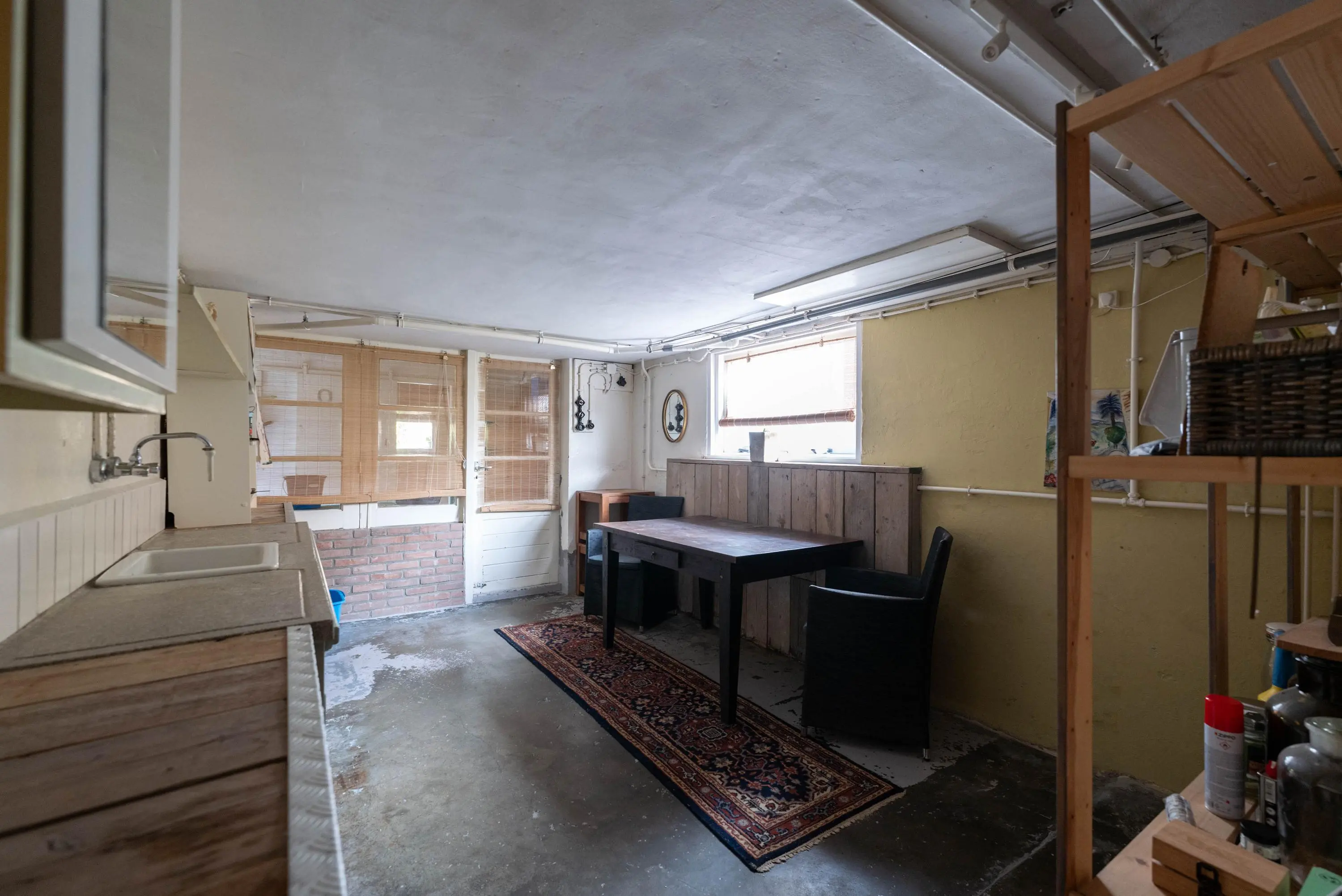 Vanuit de keuken ga je naar het ‘onderhuis’. Hier is een hal met toiletruimte en achterdeur naar de tuin. Het souterrain heeft 2 kamers welke ingericht zijn als een werkkamer en als tweede keuken. Deze ruimten worden verwarmd door middel van radiatoren. Aan de achterzijde is een berging/bijkeuken met wasmachine- en drogeropstelling en een achterdeur naar de tuin. Daarachter is een berging vanwaar je inpandig naar de garage gaat.