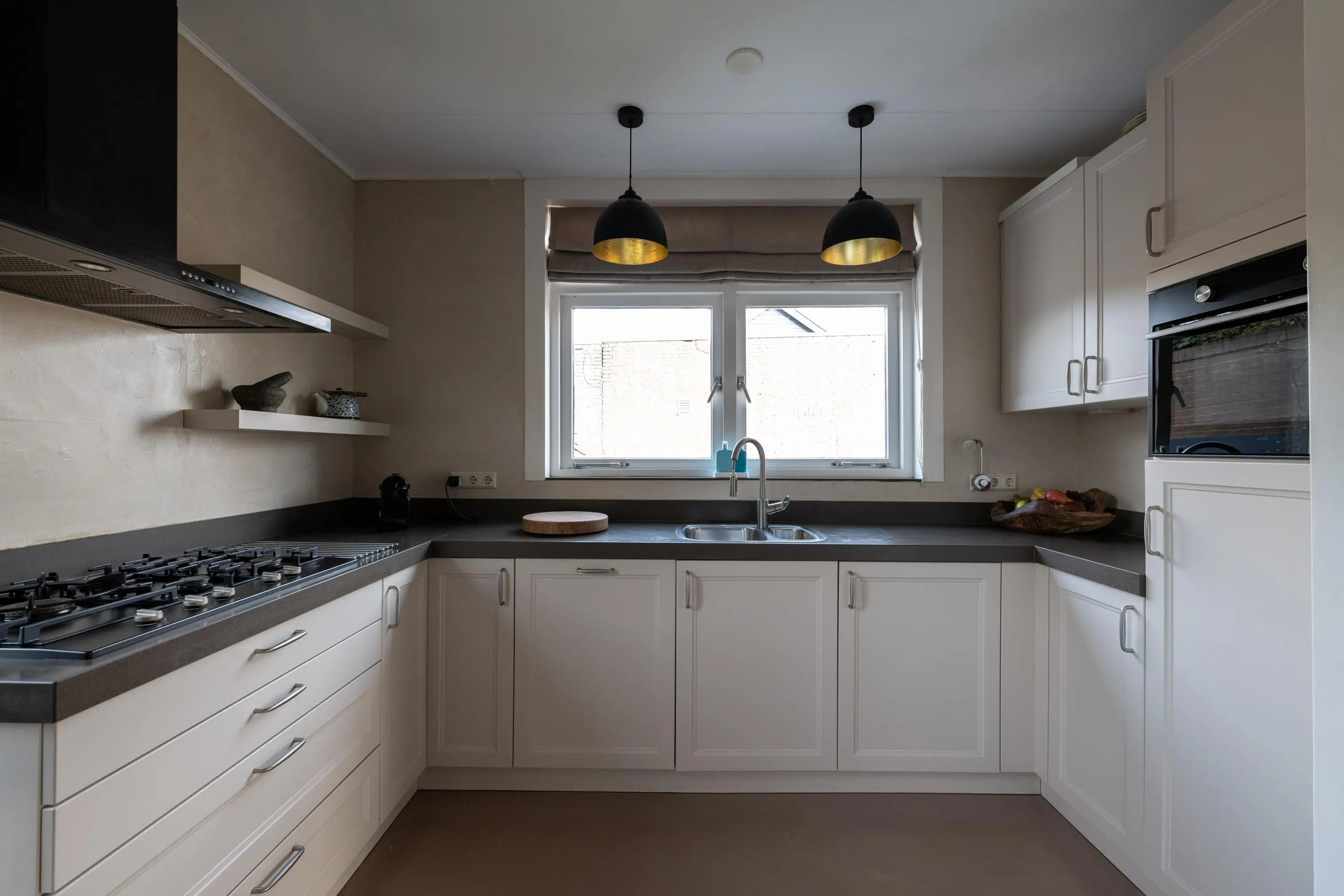 Entree met meterkast en cv-ruimte. Aan de voorzijde is de sfeervolle woonkamer met houtkachel. De gedeeltelijk open keuken is ruim en is in U-opstelling en voorzien van provisiekast. Deze woonkeuken is voorzien van inbouwapparatuur zoals de 5-pits gaskookplaat met afzuigkap, oven, koelkast, vriezer en vaatwasser. Vanaf hier kun je zowel naar de 1e verdieping als het souterrain.