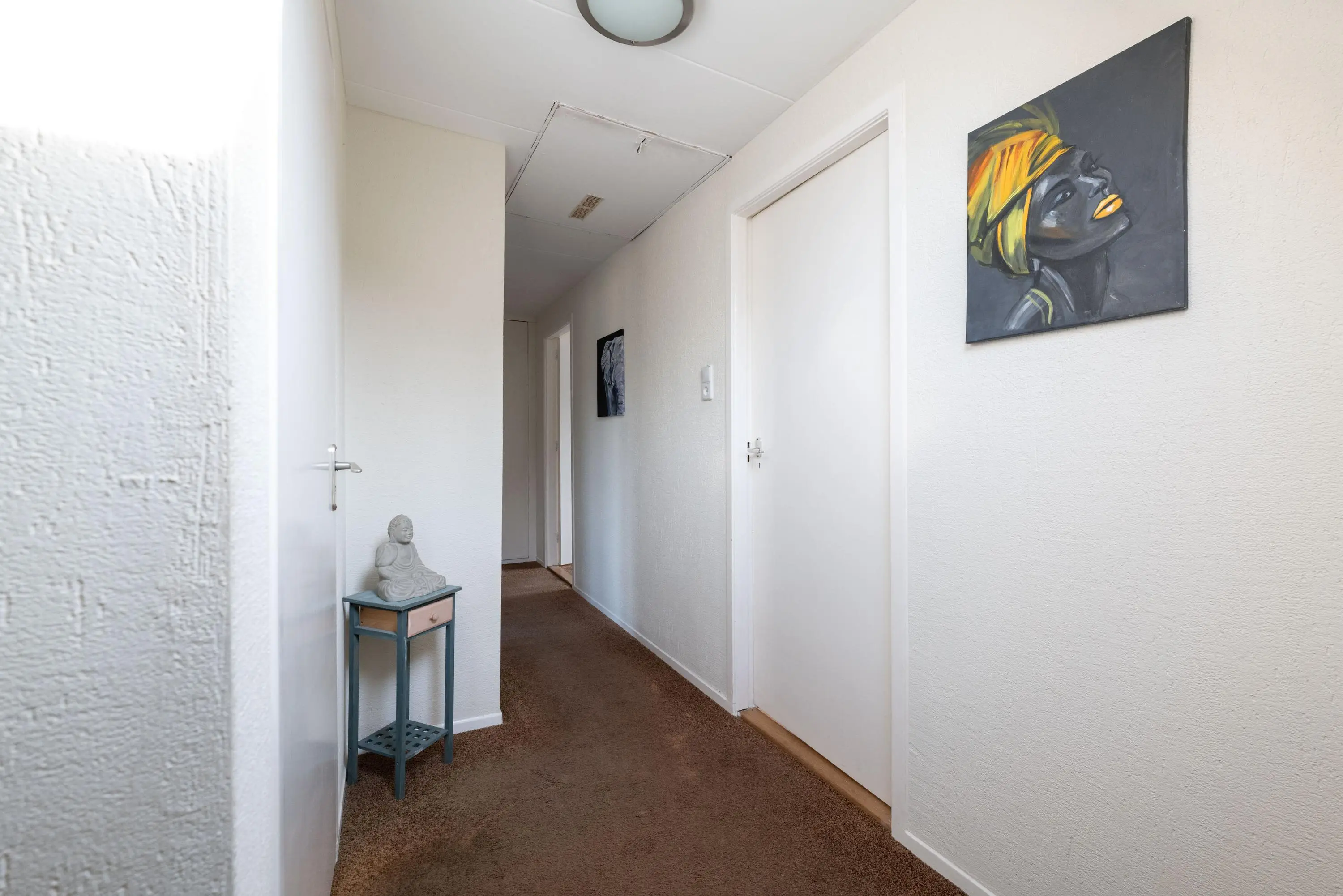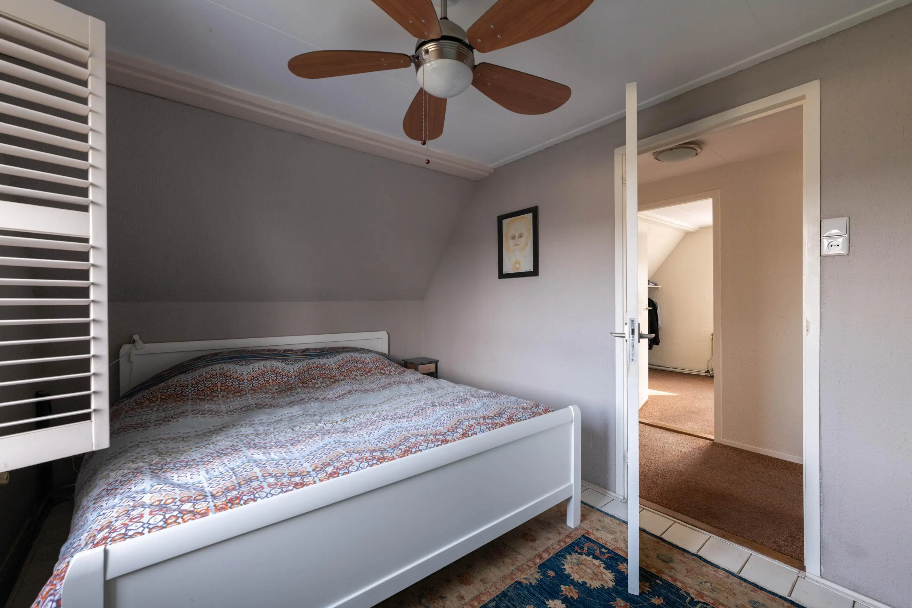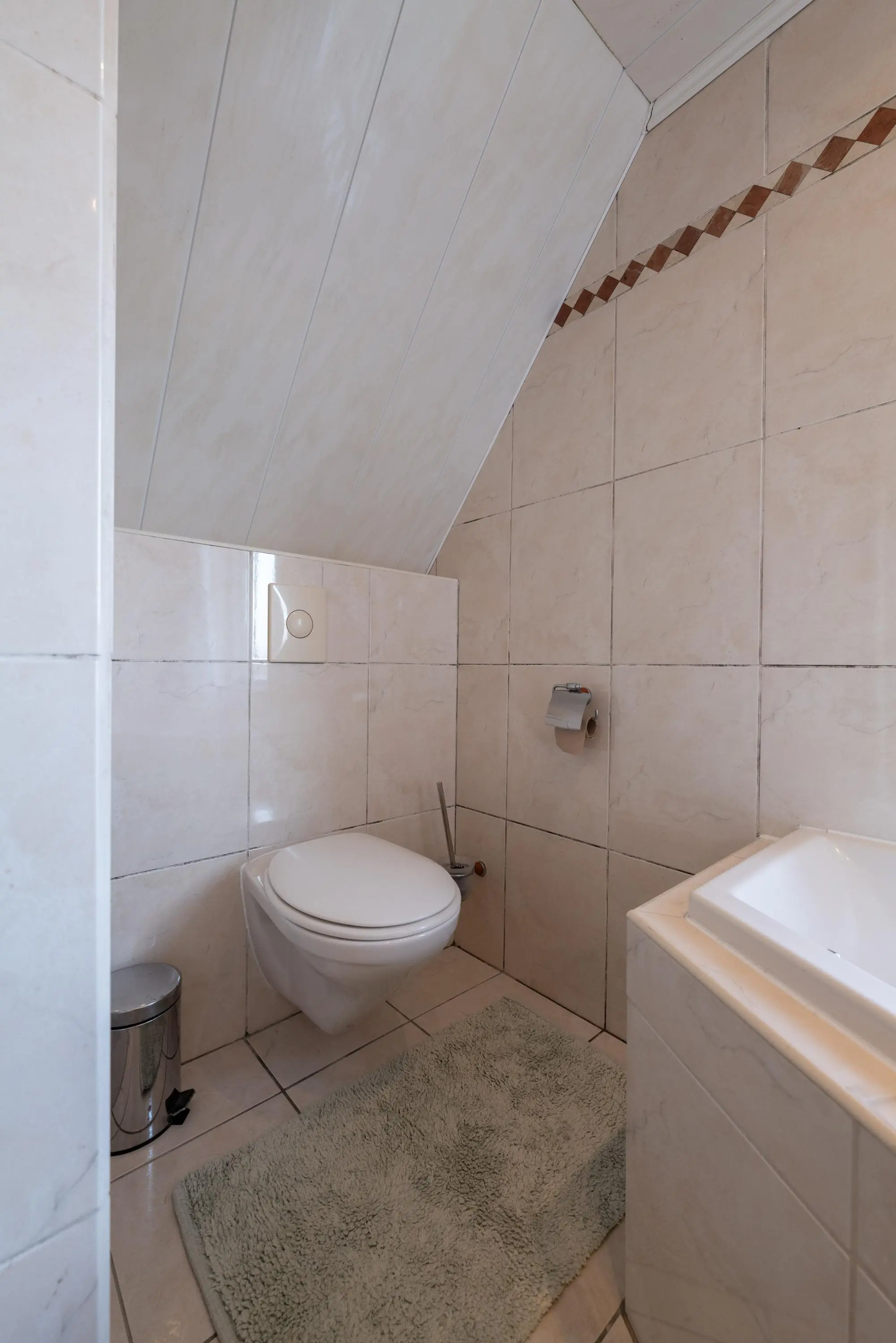 De overloop geeft toegang tot de 3 slaapkamers en de badkamer op deze woonlaag. Op de overloop is ook een kastruimte aanwezig. Aan de voorzijde 2 slaapkamers waarvan 1 is ingericht als kastenkamer. De geheel betegelde badkamer heeft een ligbad met douche, 2e toilet en een wastafelmeubel met designradiator. Het plafond is voorzien van inbouwverlichting.