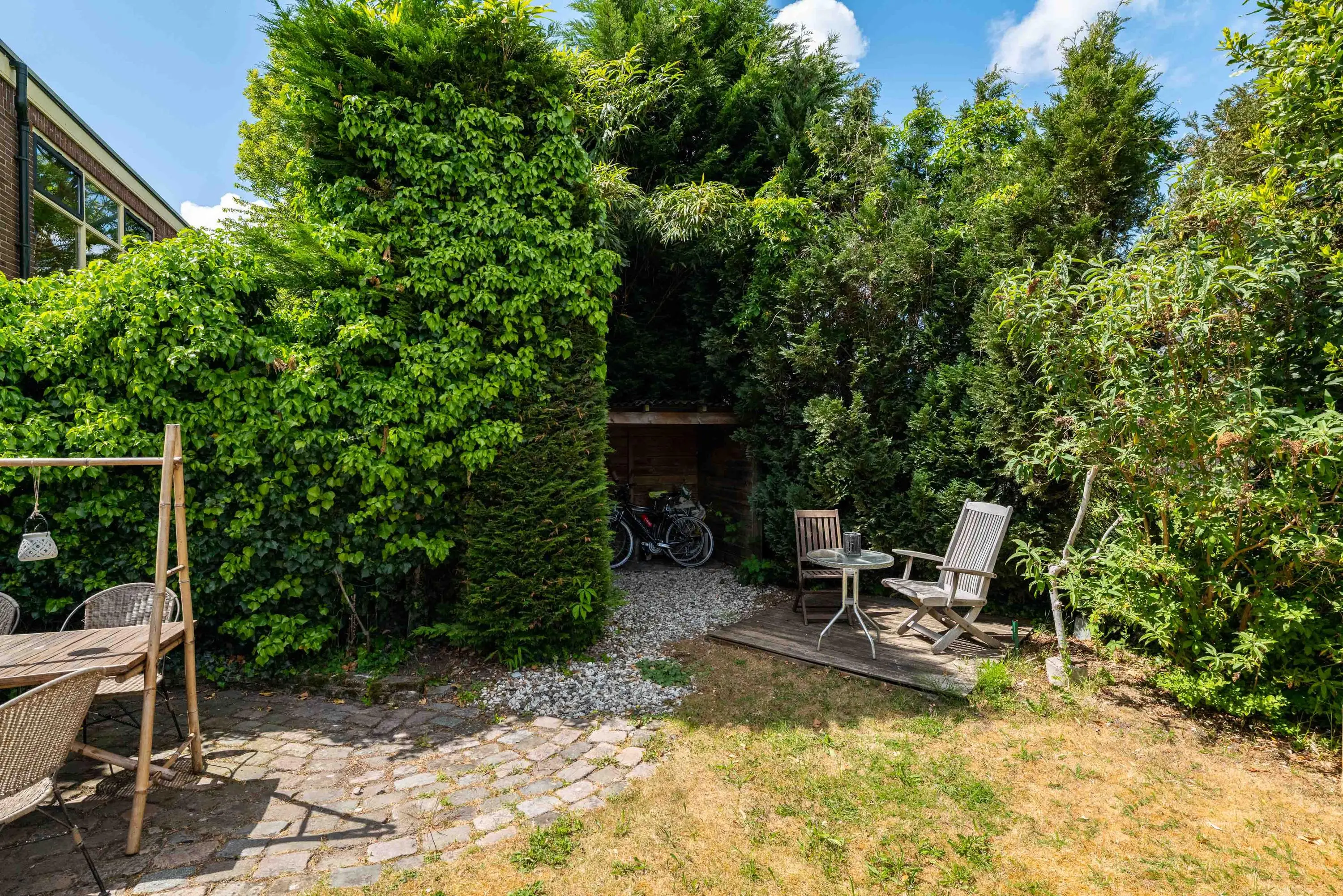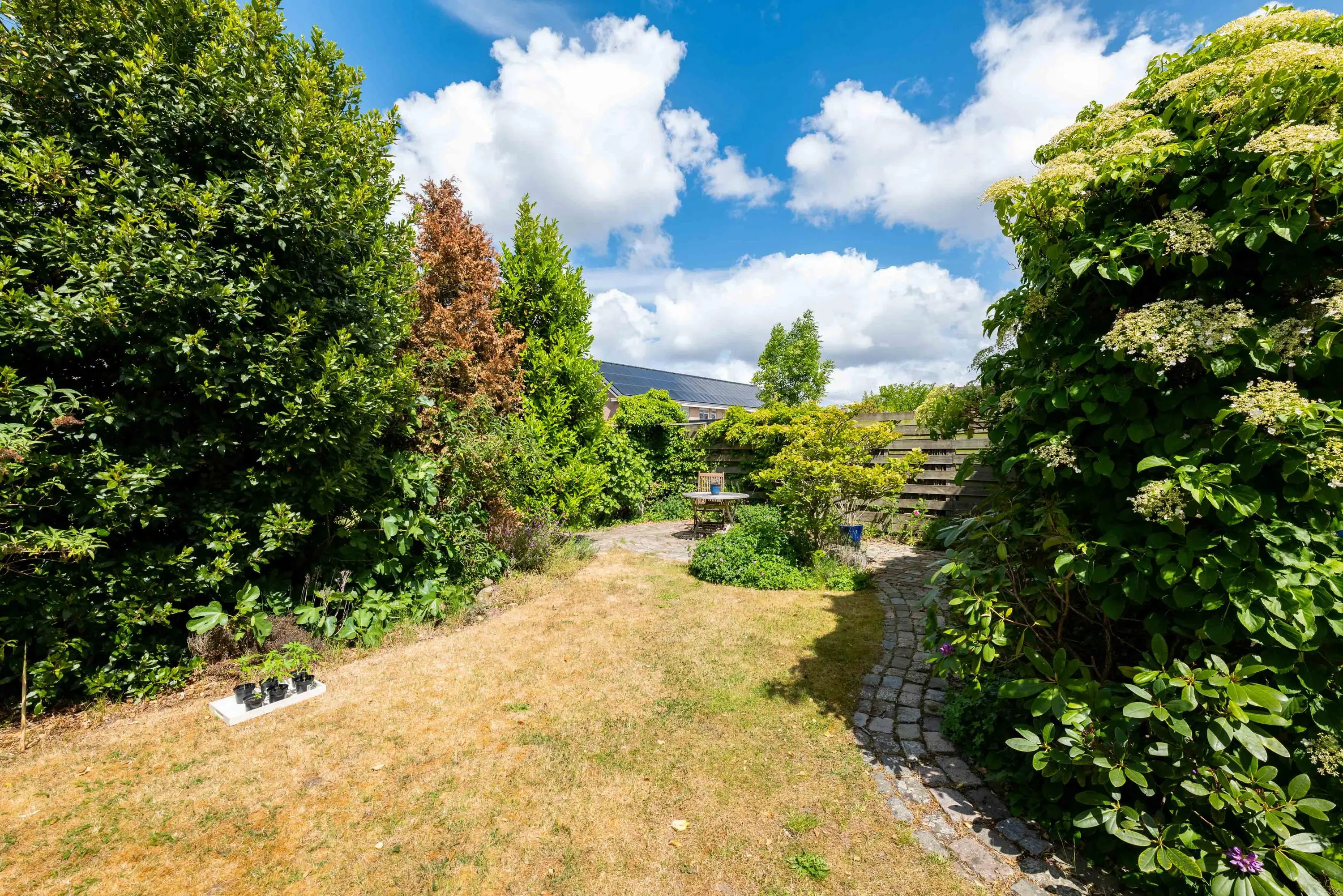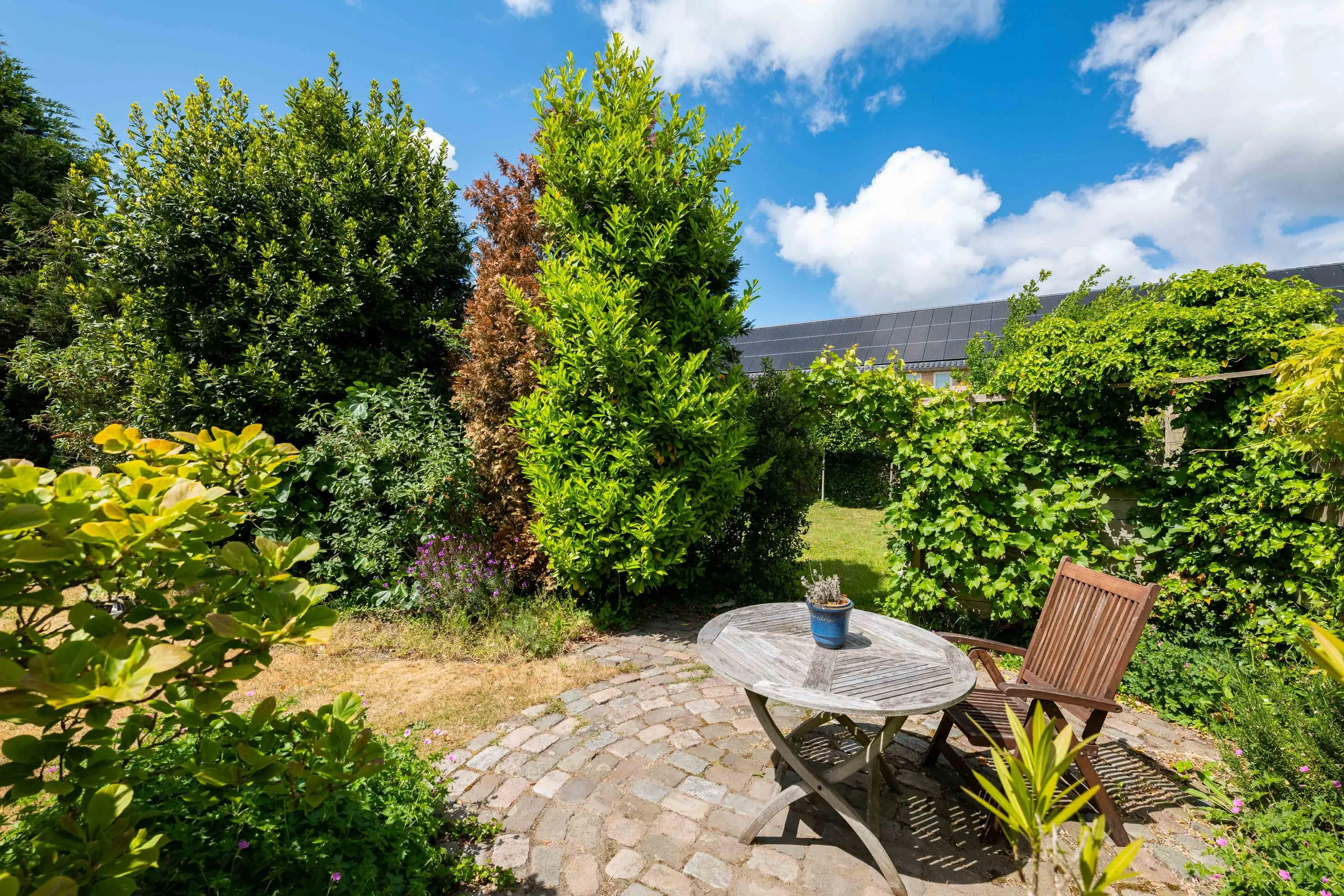 De grote achtertuin is ingericht met een gazon, terrassen, houtopslag en enkele bomen. Dat geeft dit huis een extra reden om fijn te kunnen wonen.